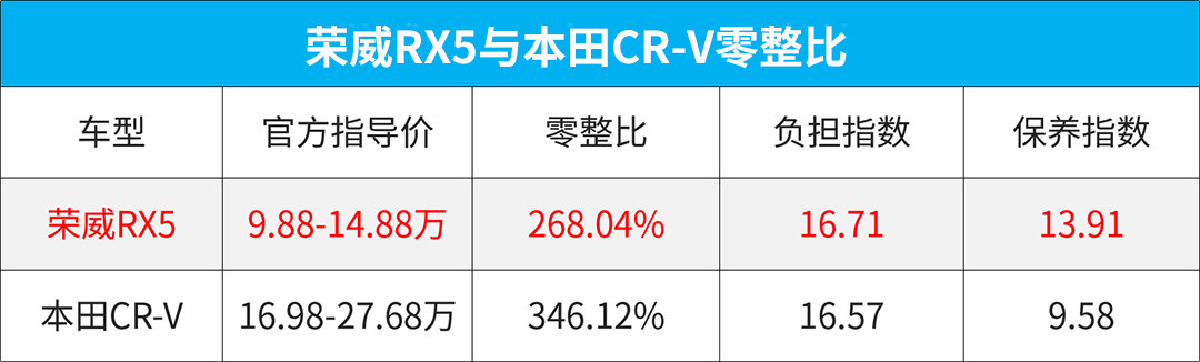 当然,质量再可靠也难免有修理的时刻,不过,据新车零整比调查数据显示,荣威RX5的新车零整比268.04%,比同级车CR-V 346.12%的零整比低了78%左右。要知道,零整比越小,后期维修费用支出也就越低。