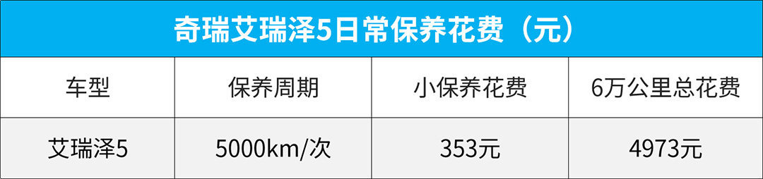 远不止此,艾瑞泽5后期用车过程中所涉及的花费也非常便宜。后期用车保养层面,艾瑞泽5保养间隔周期为5000km/次,每次小保养更换机油机滤(+工时费)的总花费为353元,若按照1年行驶2万公里计算,6万公里保养总花费约为4973元。