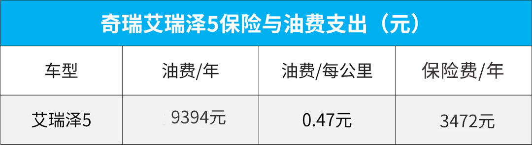 保险与油费层面,按照最经济方案(交强险+车船税+商业保险)购买保险,艾瑞泽5每年保险总花费大概为3472元;新车百公里油耗约为6.4L/100km,按照1年行驶2万公里、92#油价7元/升计算,艾瑞泽5每年在油费上的总支出为9394元,每公里大概是4毛钱。