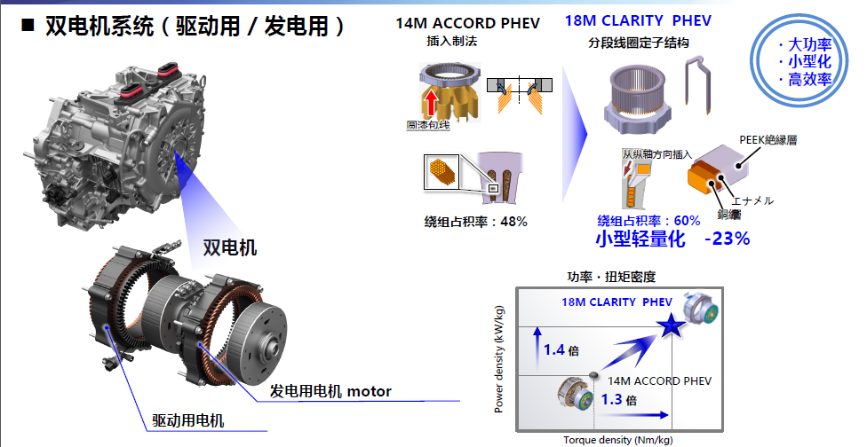 SPORT HYBRID e+对双电机系统进行了优化,有原来的圆形绕组方式变为方形线圈,使得电机总体积中线圈的占比从原来的48%提升至60%,同时电机实现了23%的小型化,功率密度比原来提高到1.4倍,扭矩密度提高到1.3倍。