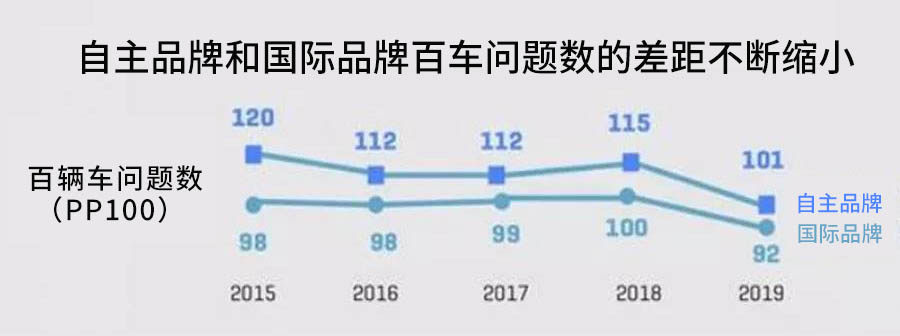 J.D.Power发布的《2019中国新车质量研究数据》显示,近年来自主品牌的百车质量问题数正在逐年降低,与国际品牌之间的差距在不断缩小。其中自主品牌的百车质量问题数从2015年的120个下降到2019年的101个,与国际品牌的差距从2015年的32个下降到2019年的9个。