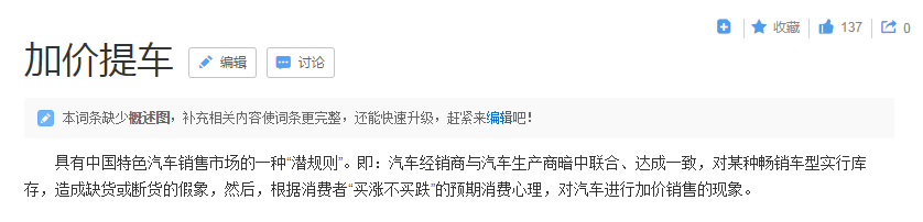 在百科中对“加价提车”的描述为“具有中国特色汽车销售市场的一种“潜规则”。利用消费者“贵有贵的道理,便宜没好货”的心理,厂家会针对部分热度高、产品力强、销量好的车型进行加价处理。