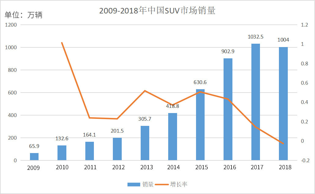 2009年,中国SUV市场全年销量仅有65.9万辆,而到了2018年,这个数字是1004万辆。十年间,中国SUV市场的销量增长了14倍,远远高于汽车市场的增长率。
