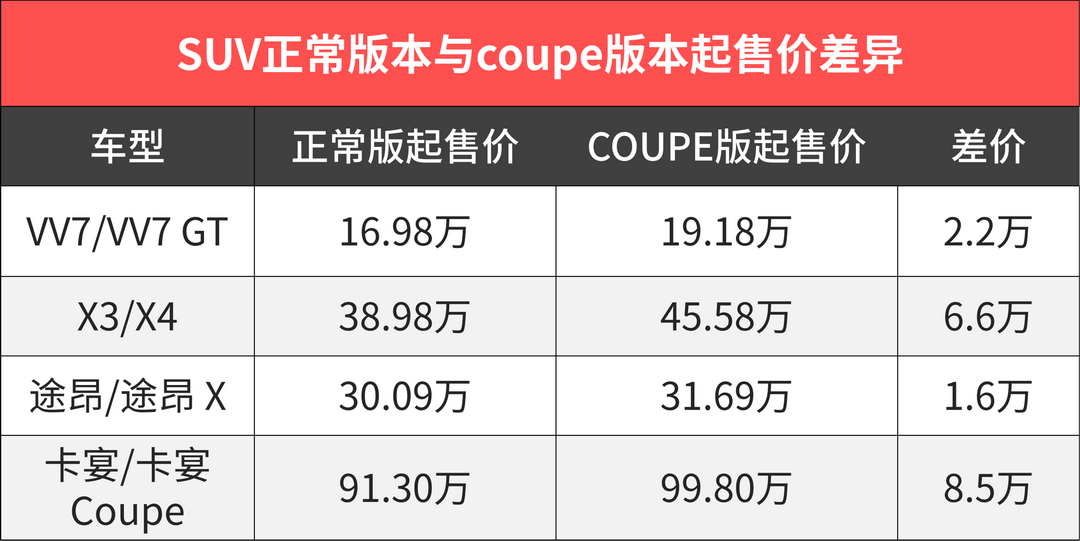 当然,各位大佬也不是不懂Coupe市场只是蚊子腿上的肉。能吃是能吃,前提是投入小,所以我们看到这些Coupe SUV基本是在普通版的基础上换壳,加配置,刷软件。