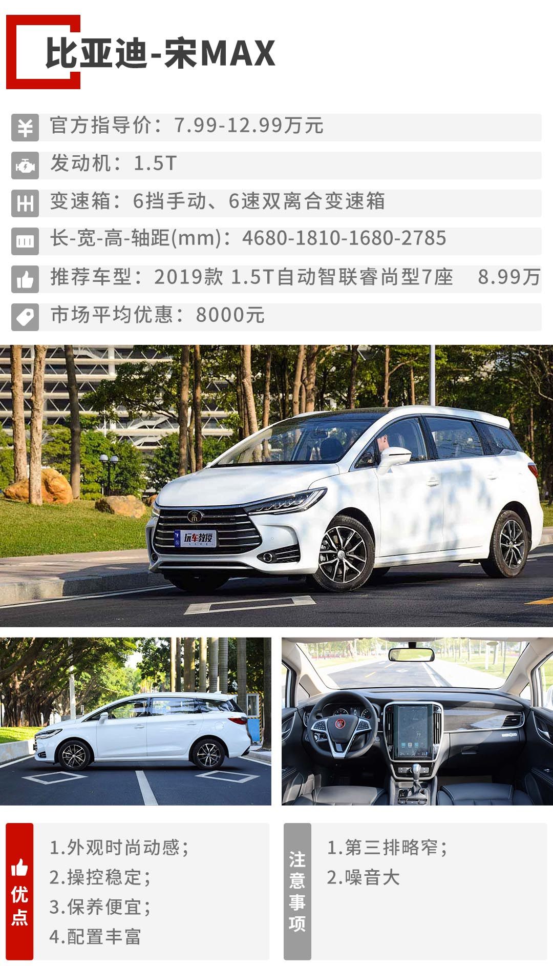 宋MAX提供1.5L+6MT和1.5T+6速双离合两种动力组合,座椅采用2+3+2的7座和2+2+2的6座布局。教授推荐2019款 1.5T自动智联睿尚型7座版,受限于较小的车身尺寸,宋MAX第三排的空间表现并不理想,所以更多的消费者平时把它当5座车用,因此2+3+2的7座布局会比2+2+2的6座布局更实用。