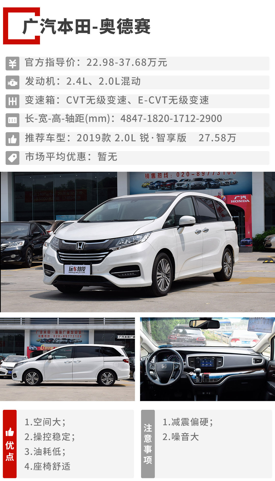 奥德赛提供2.0L混动和2.4L自吸两种动力,与2.4L发动机匹配的是CVT变速箱,平顺性表现不错,但行驶时的噪音比较大。2.0L混动车型在EV模式下的噪音相比燃油版车型低不少,而且在中低速段的加速更强,所以教授推荐2.0L混动版车型。