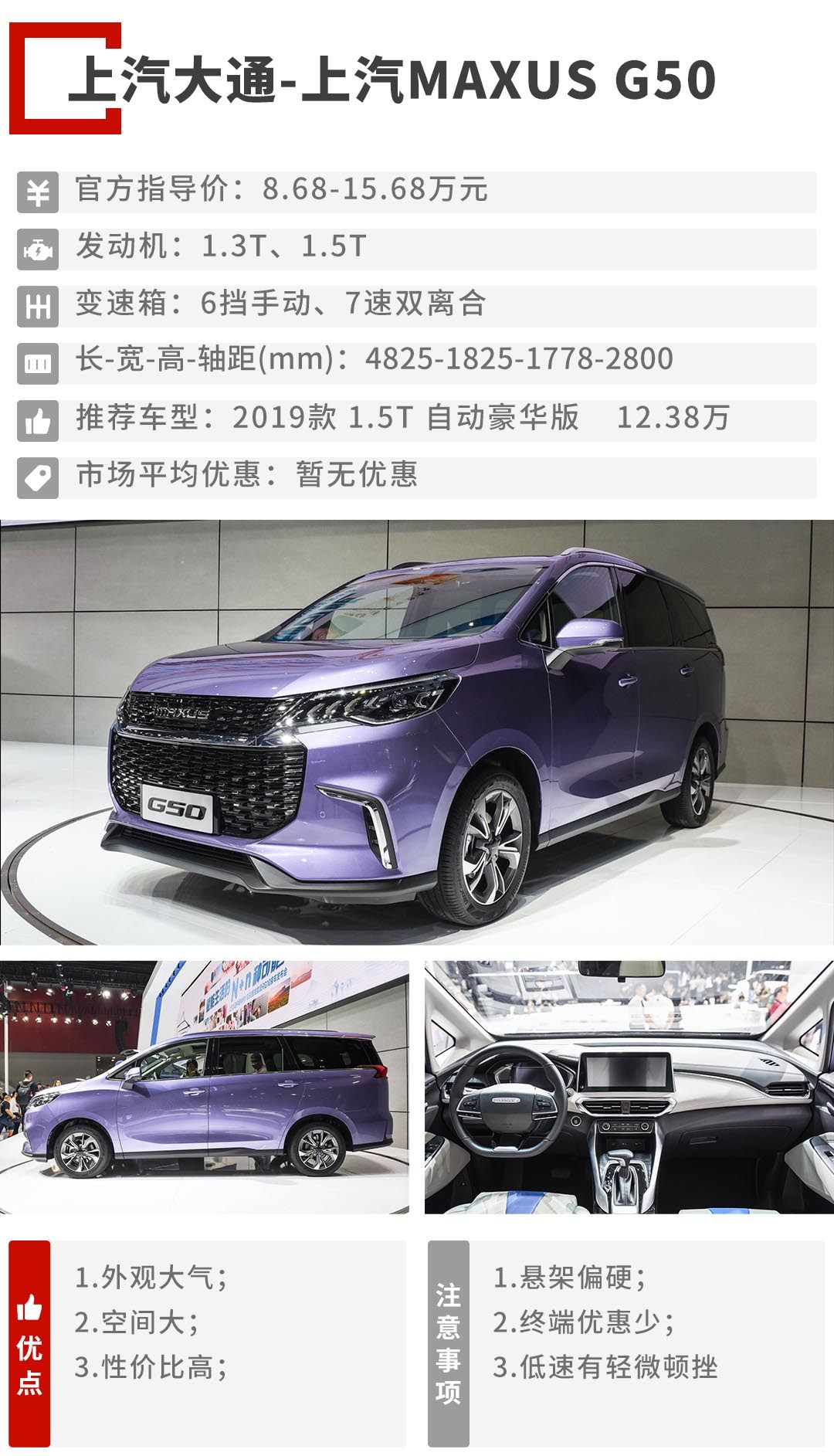 上汽MAXUS G50提供1.3T和1.5T两种动力,其中1.3T三缸发动机均匹配6速手动变速箱,1.5T发动机均匹配7速双离合变速箱。