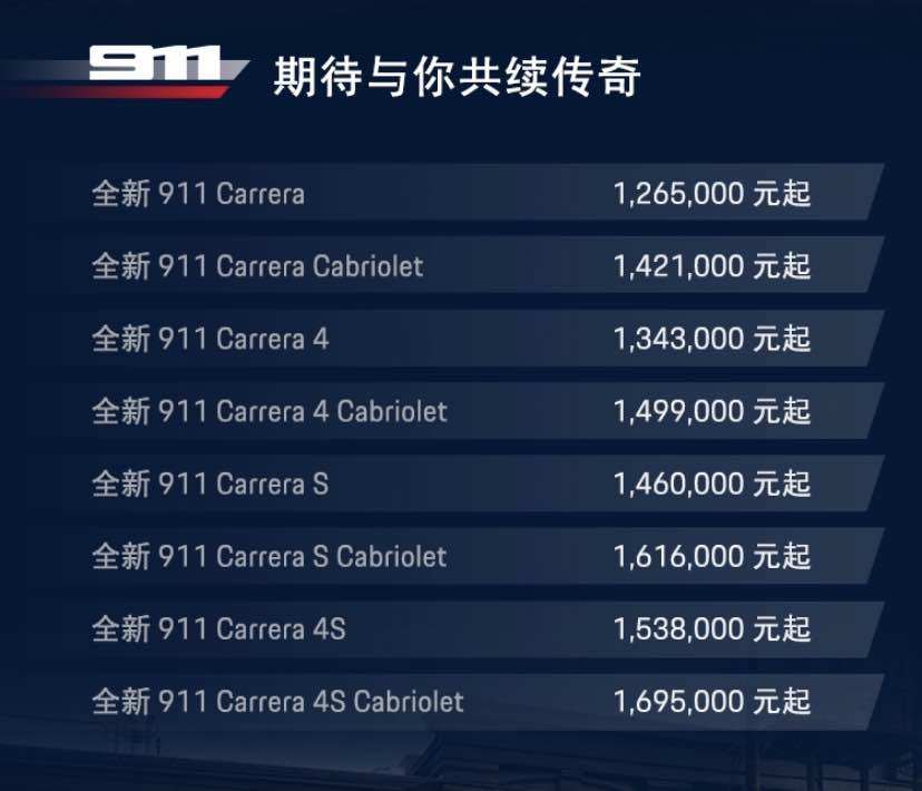 10月11日,第八代保时捷911(代号992)在中国上海正式上市,售价126.5——169.5万元。第八代保时捷911共推出包含911 Carrera 、911 Carrera Cabriolet(敞篷)、911 Carrera S、911 Carrera S Cabriolet(敞篷)、911 Carrera 4、911 Carrera 4 Cabriolet(敞篷)、911 Carrera 4S、911 Carrera 4S Cabriolet在内的8款车型。
