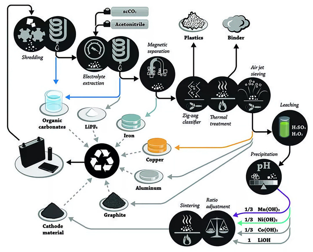 2、拆解回收,即对动力电池进行放电和拆解,实现对镍、钴、锰、铜、铝、锂等主要元素的回收,实现电池材料的循环利用,降低日后电池制造成本。