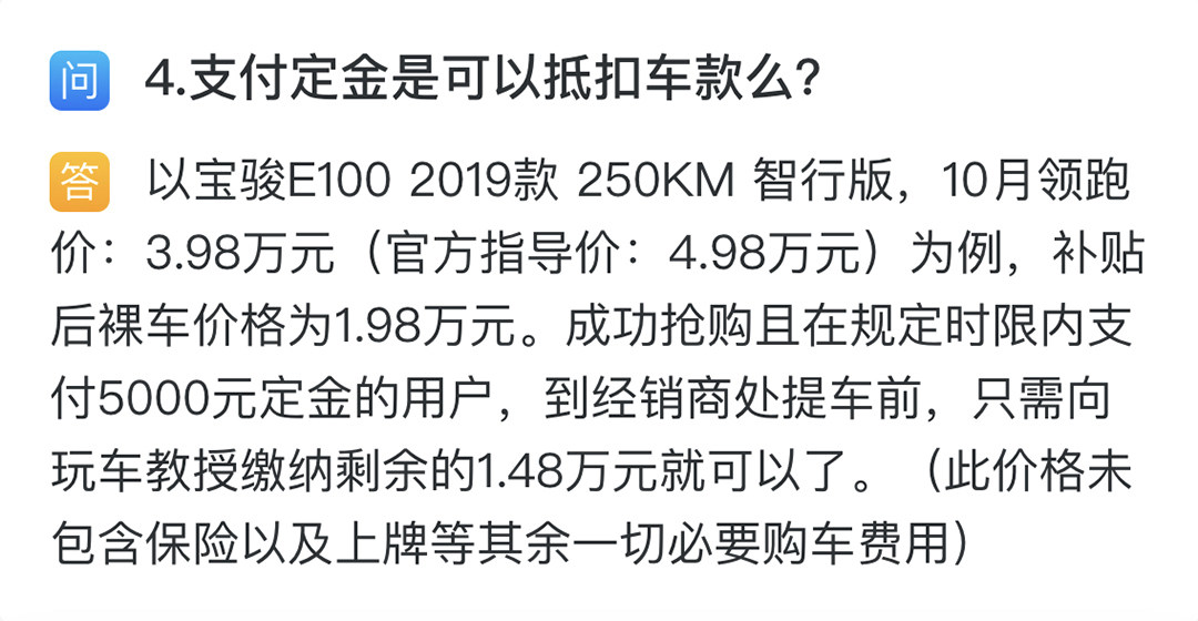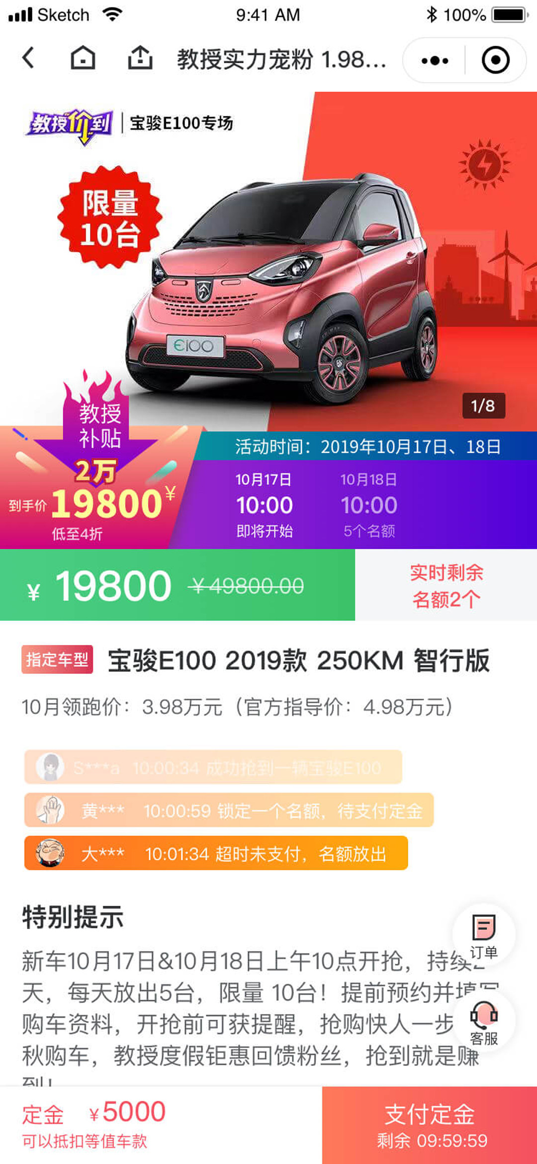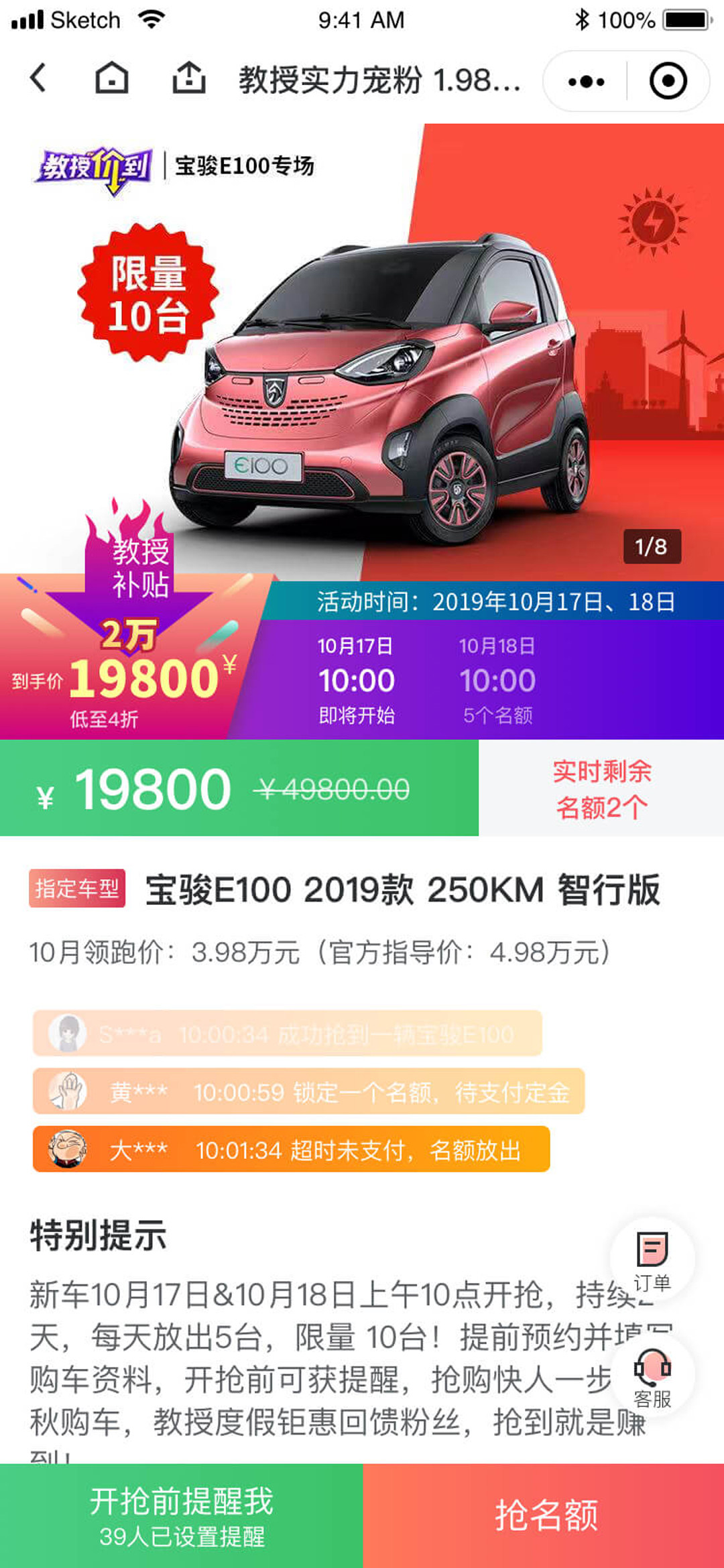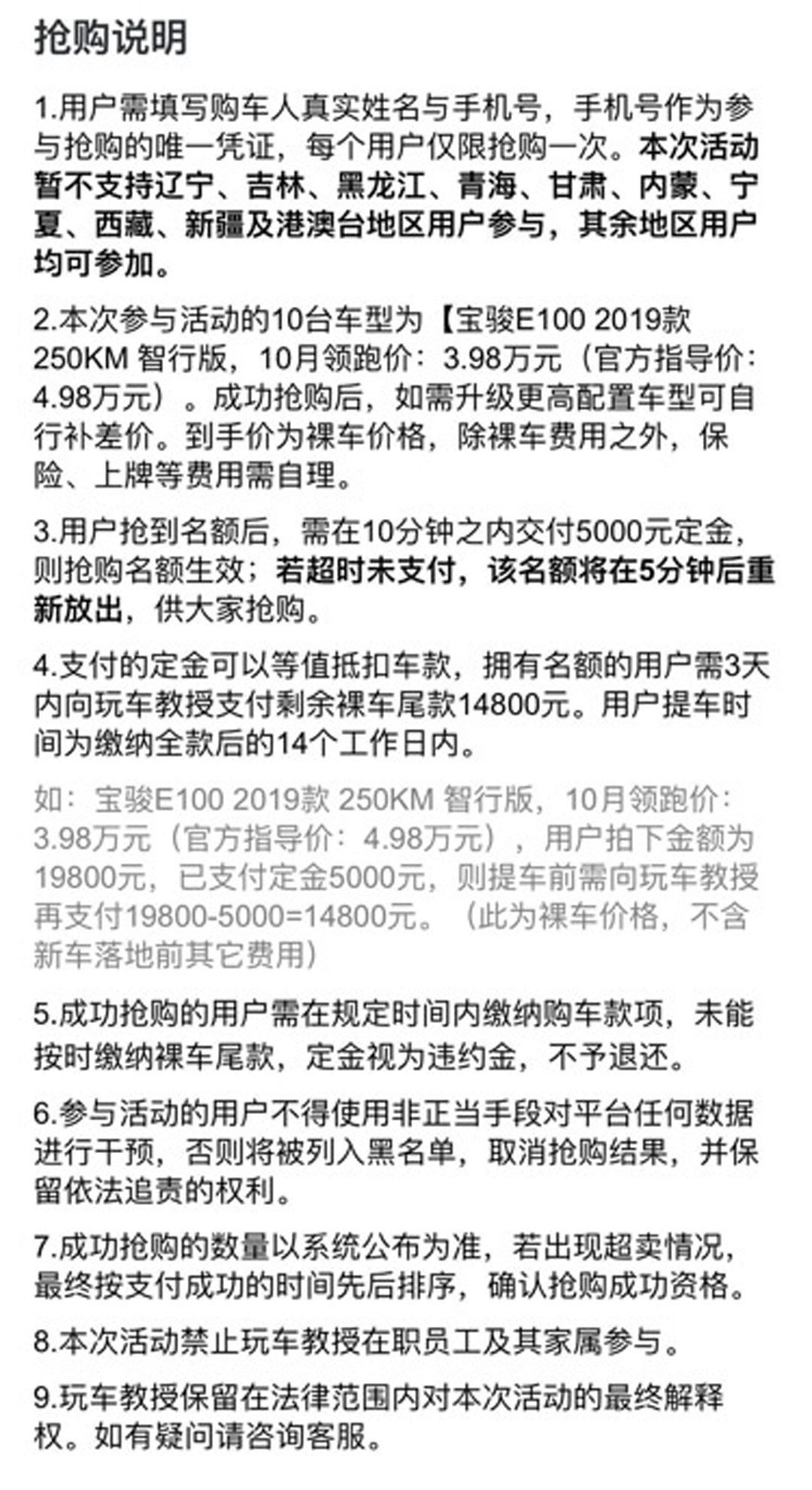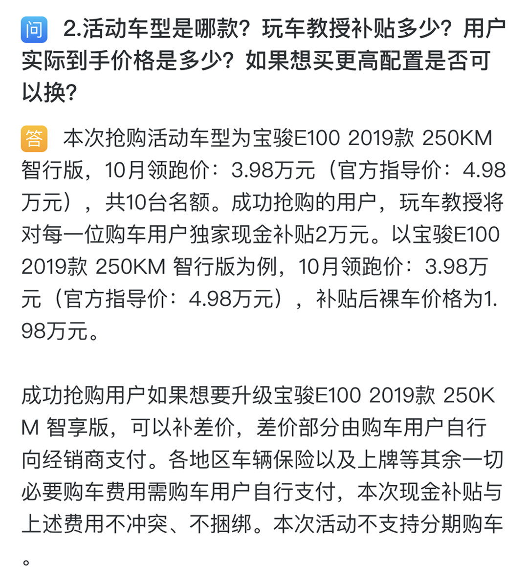 为了回馈粉丝,教授推出宝骏E100超低价格抢购新车活动,在本月17-18日两天上午10点,在玩车教授微信小程序推出教授“价”到钜惠抢购活动,每天限定5辆!