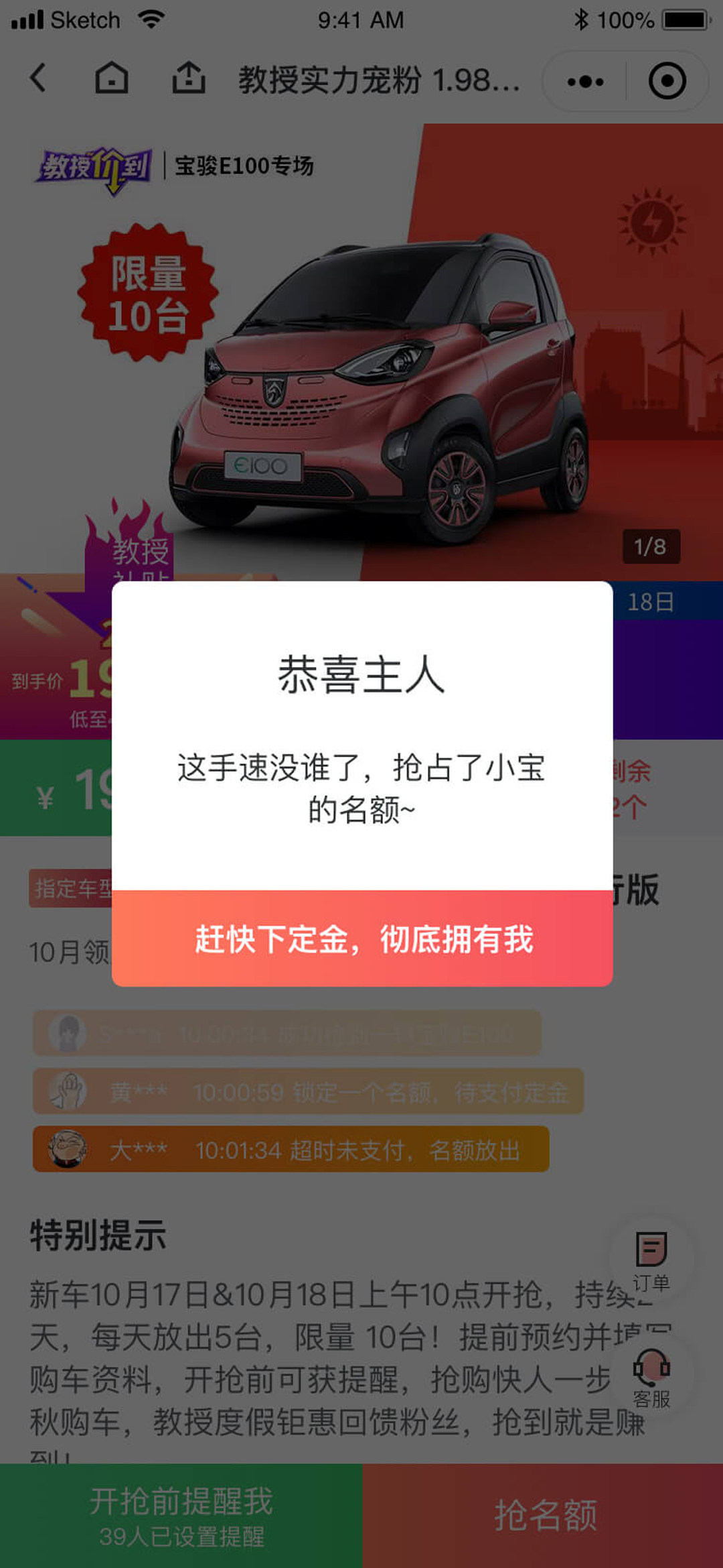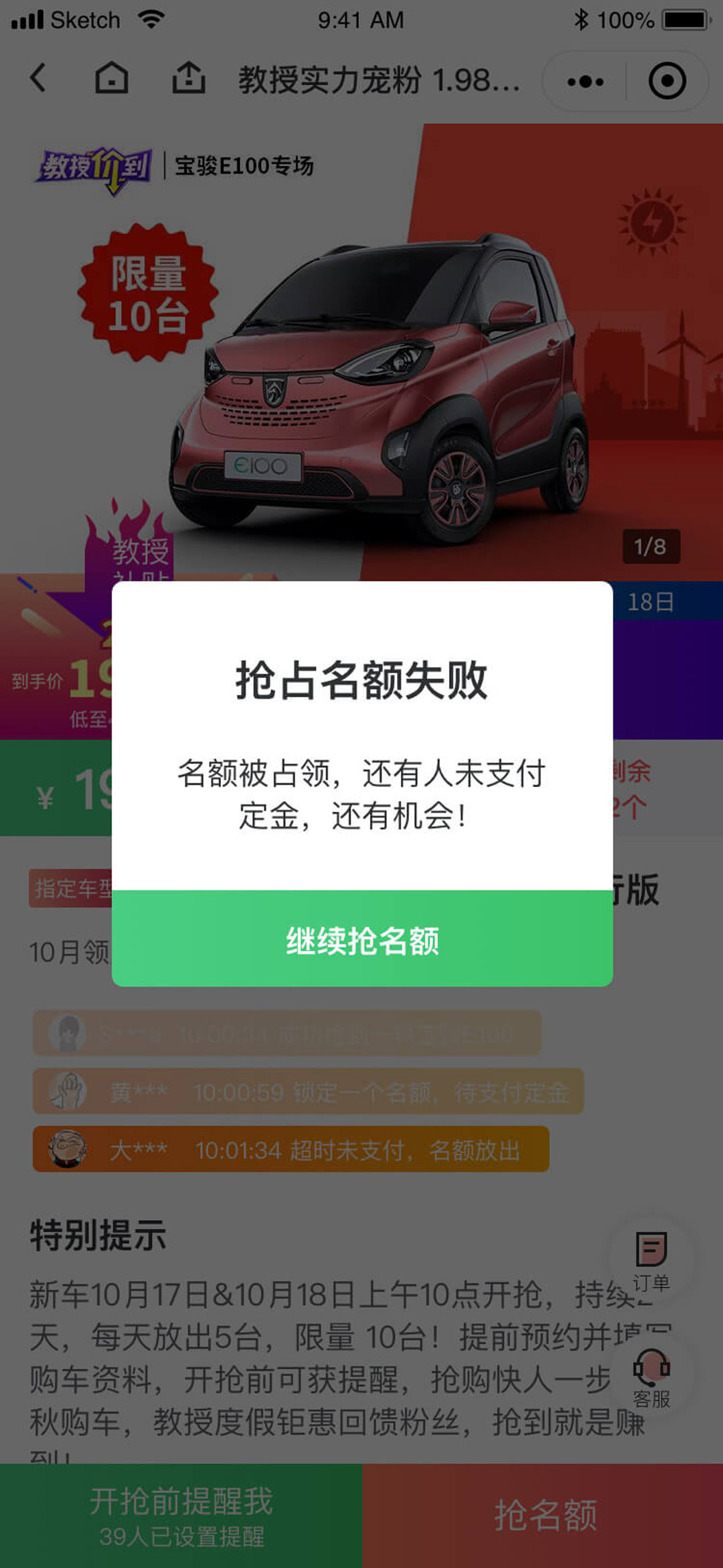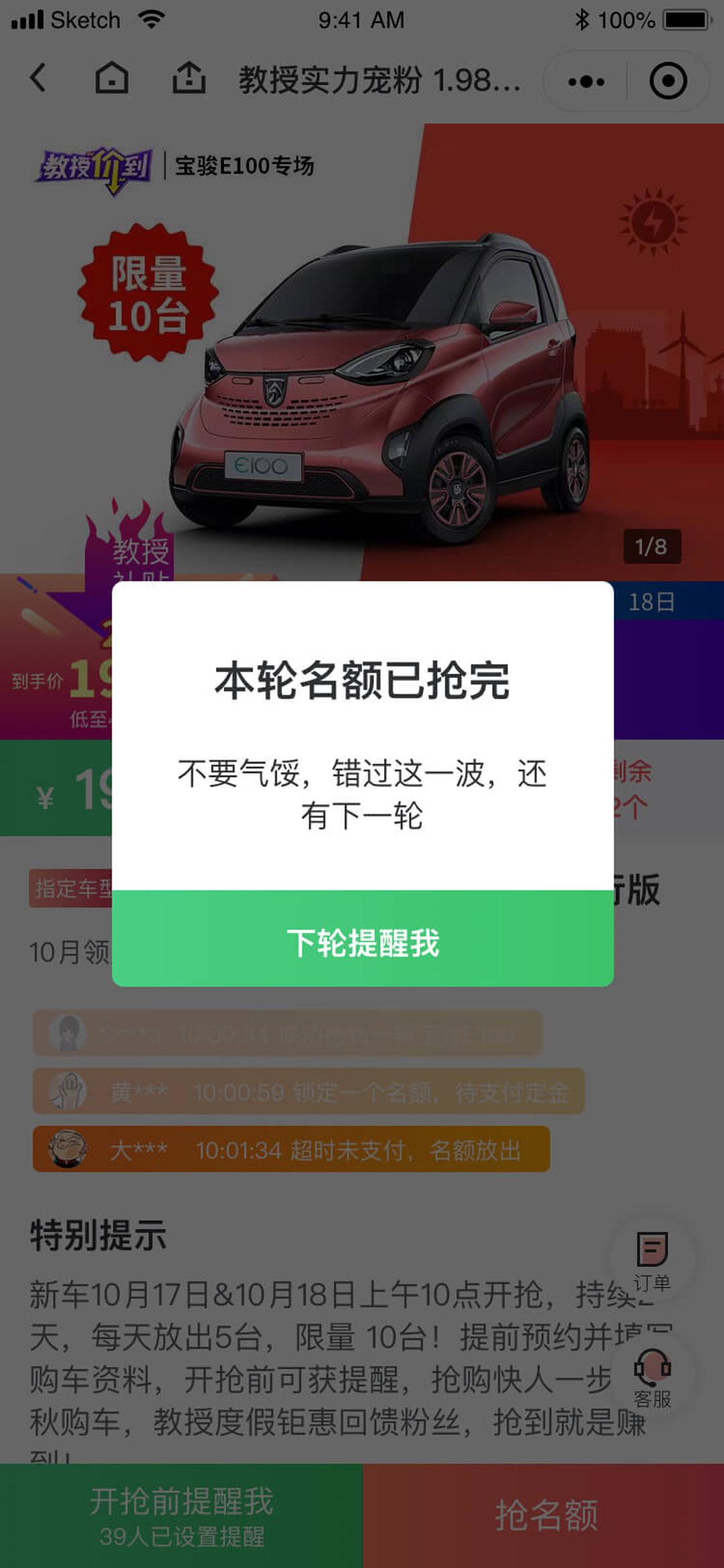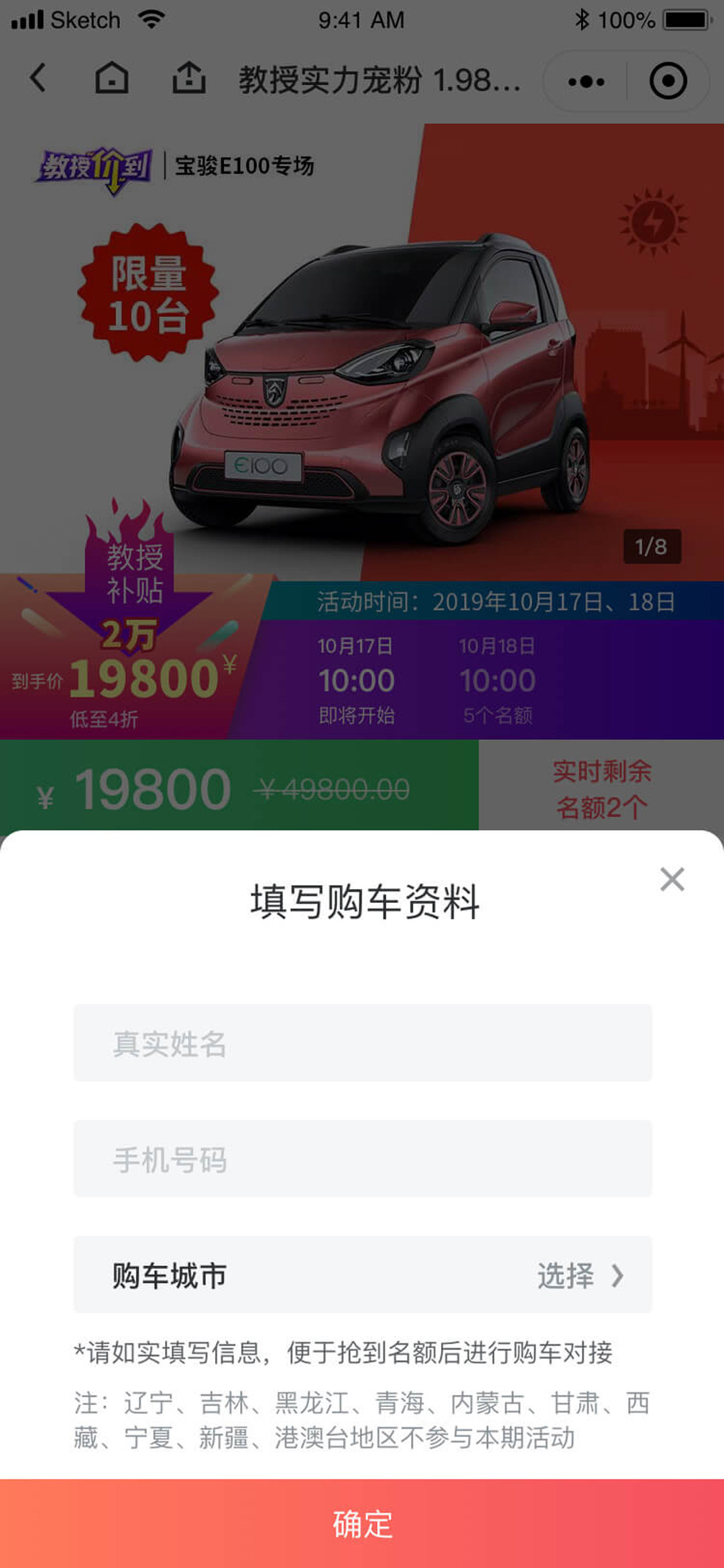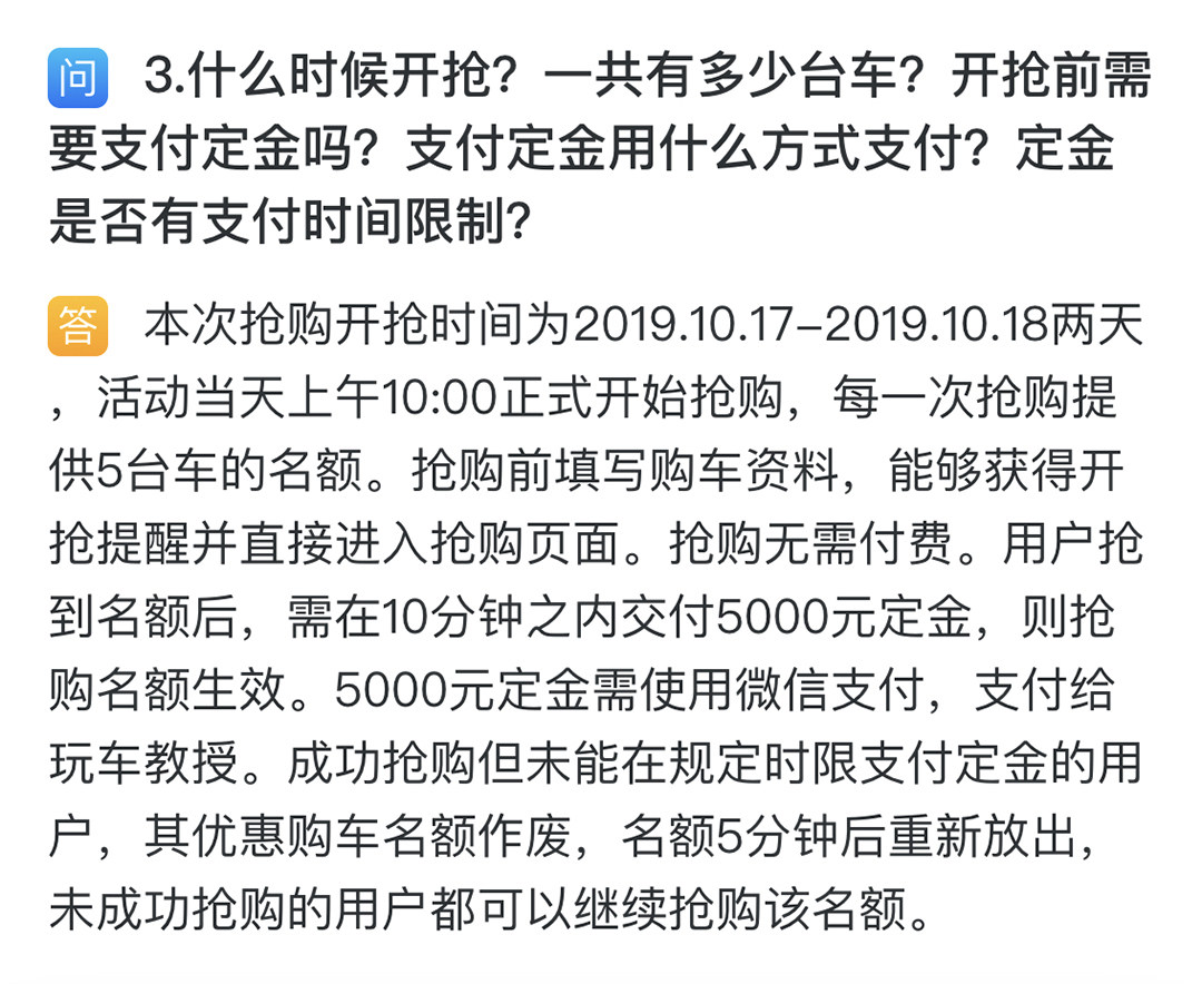抢购活动未开始前,您可以打开玩车教授小程序,点击图片进入抢购页面,通过下方按钮进行预约,填写个人资料有即可预约抢购活动。