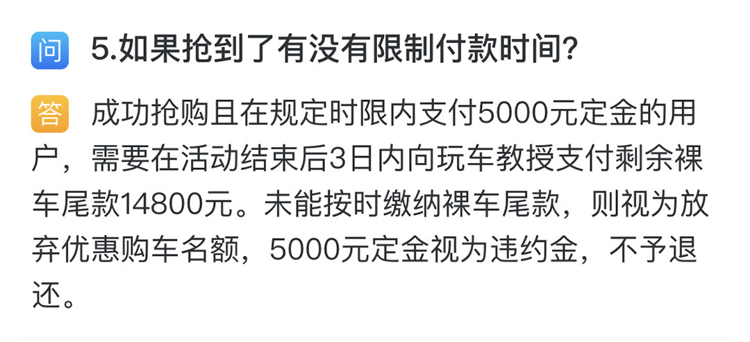 随后支付定金(5000元)及3日内支付剩余尾款(14800元)后(合计1.98万),即可期待着教授的安排,把车辆带回家;当然,1.98万是裸车价格,不含新车落地前其他费用。