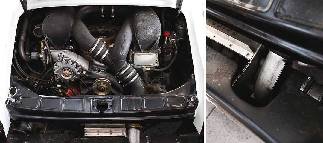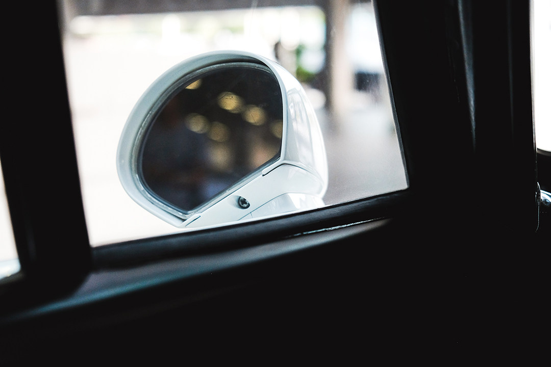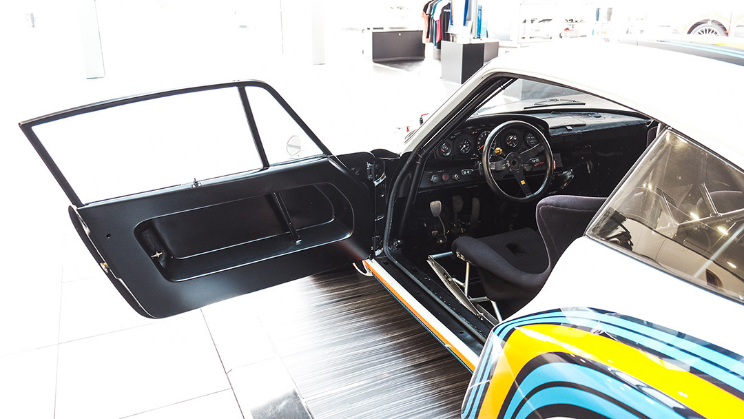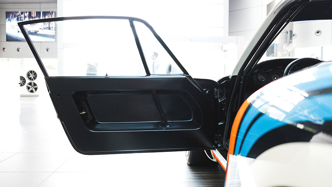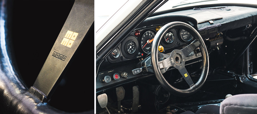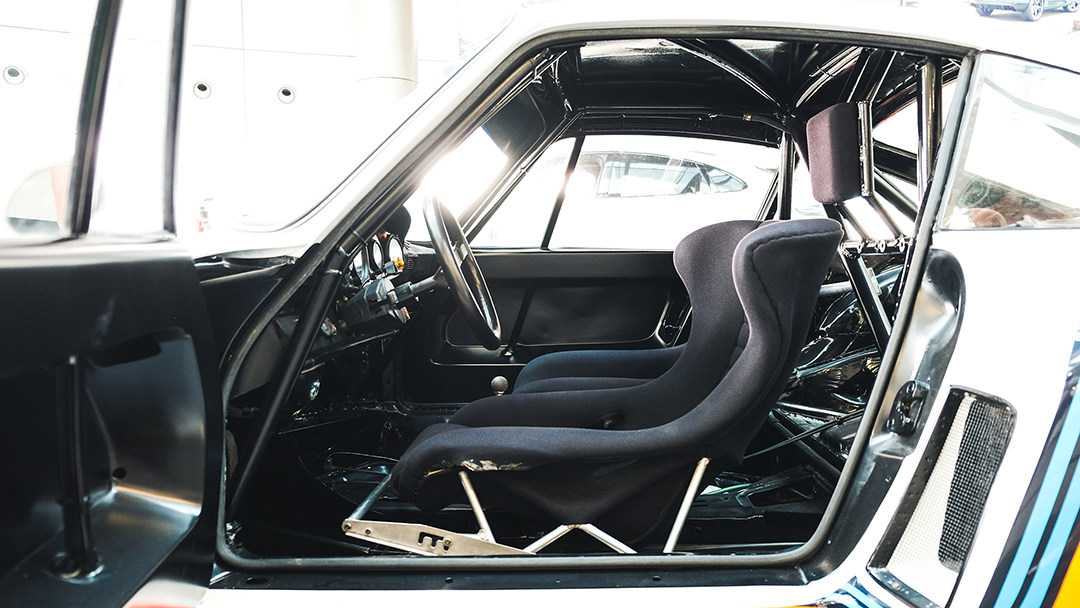 打开车门,935的内饰已被拆得精光,原本930 Turbo的车厢就十分简单,来到935车内,经过大幅度减重处理后的内饰就更加简陋、粗糙了。所有无关紧要的饰板和非必要装置都不见踪影,门把手变成了一跟小小的钢线,中控台上也只留下了仪表盘、MOMO赛用方向盘以及显眼的换挡提示灯。