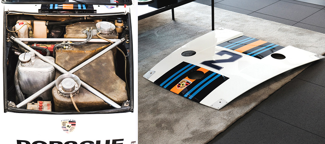 在展厅内看到935的那一刻,教授是如此的兴奋;光滑的Flatnose“平鼻”车头,尺寸惊人的宽体轮拱以及标志性的鲸式尾翼,几乎所有的赛车爱好者都会认出这个独一无二的造型。你几乎无法看出这是一台基于930 Turbo改造的赛车,只有从维持原样的座舱部分以及狭长车尾之内留下的原厂后包围,才能发现它的911血统。