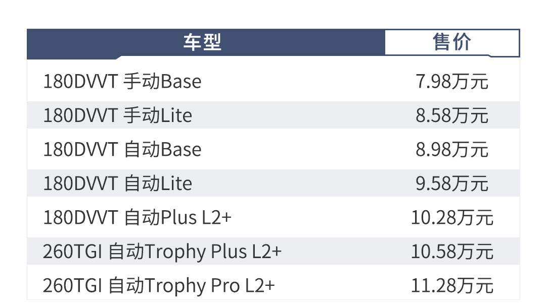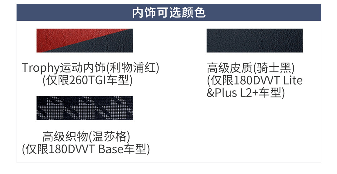 在轮胎方面,180DVVT Base和Lite车型采用17英寸铝合金多幅轮毂,180DVVT Plus L2+车型采用17英寸精车双色铝合金多幅轮毂,而260TGI 车型则是采用17寸战斧旋动轮毂。全系轮胎尺寸均为215/55 R17,260TGI 车型的轮胎采用米其林®浩悦3ST,单条报电商平台价929元。