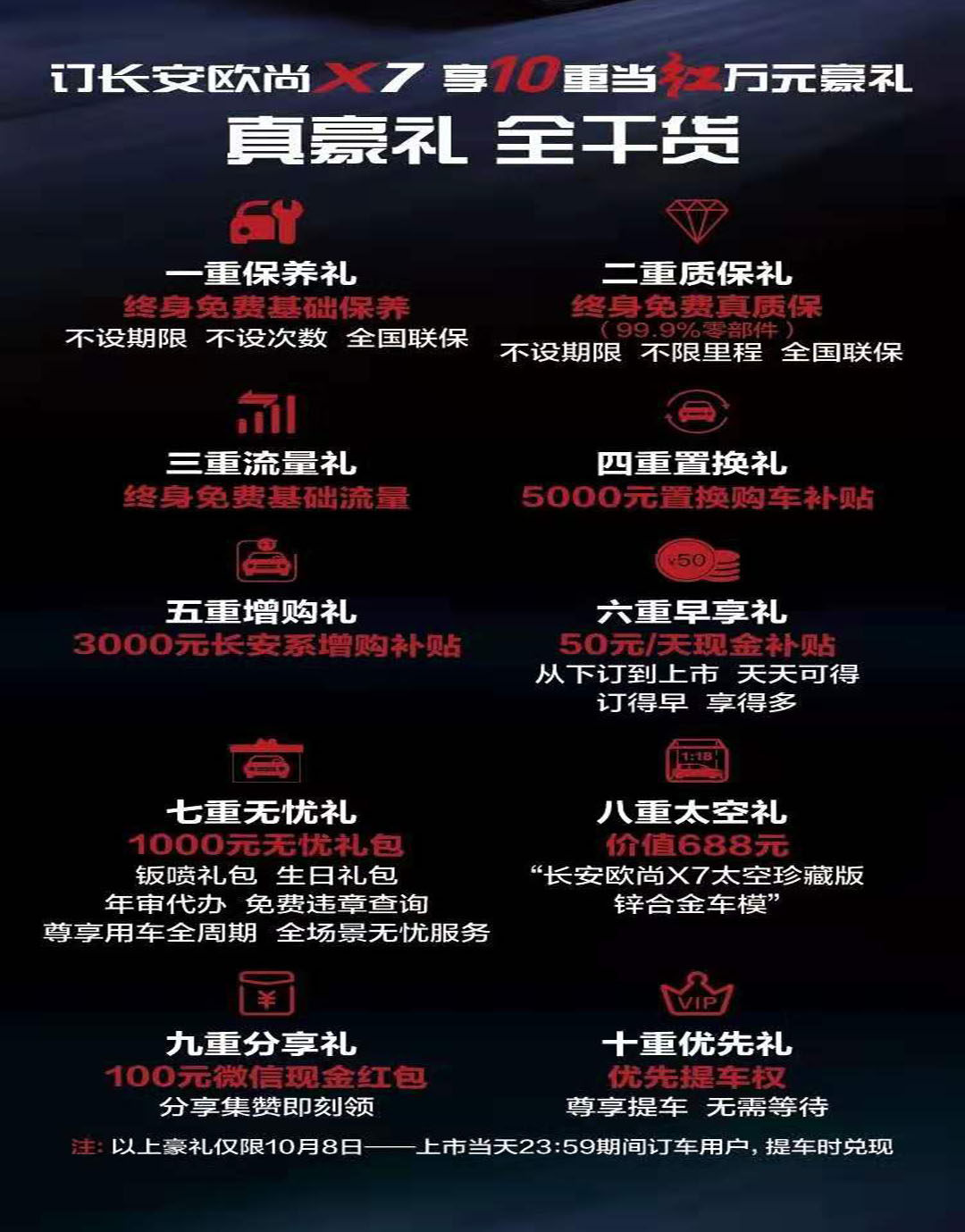 除了更低的定价,更高的配置,长安欧尚X7还带来了一项力度空前的政策。这一政策就是针对长安欧尚X7预售推出的终身免费维保政策(终身免费真质保、终身免费基础保养)、与5000元置换购车补贴、3000元长安系增购补贴、50元/天现金补贴等系列优惠政策。有了这项政策,相信长安欧尚X7的车主们应该不存在“养车贵养车难”的问题了。