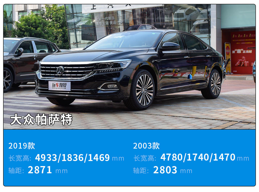 但变化同样巨大的,还有其标准的中级车尺寸,从2003款到2019款,帕萨特的长宽分别增加了153mm/96mm,轴距增加了68mm。不过由于黑色不显大,因此在视觉效果上稍微不太明显。