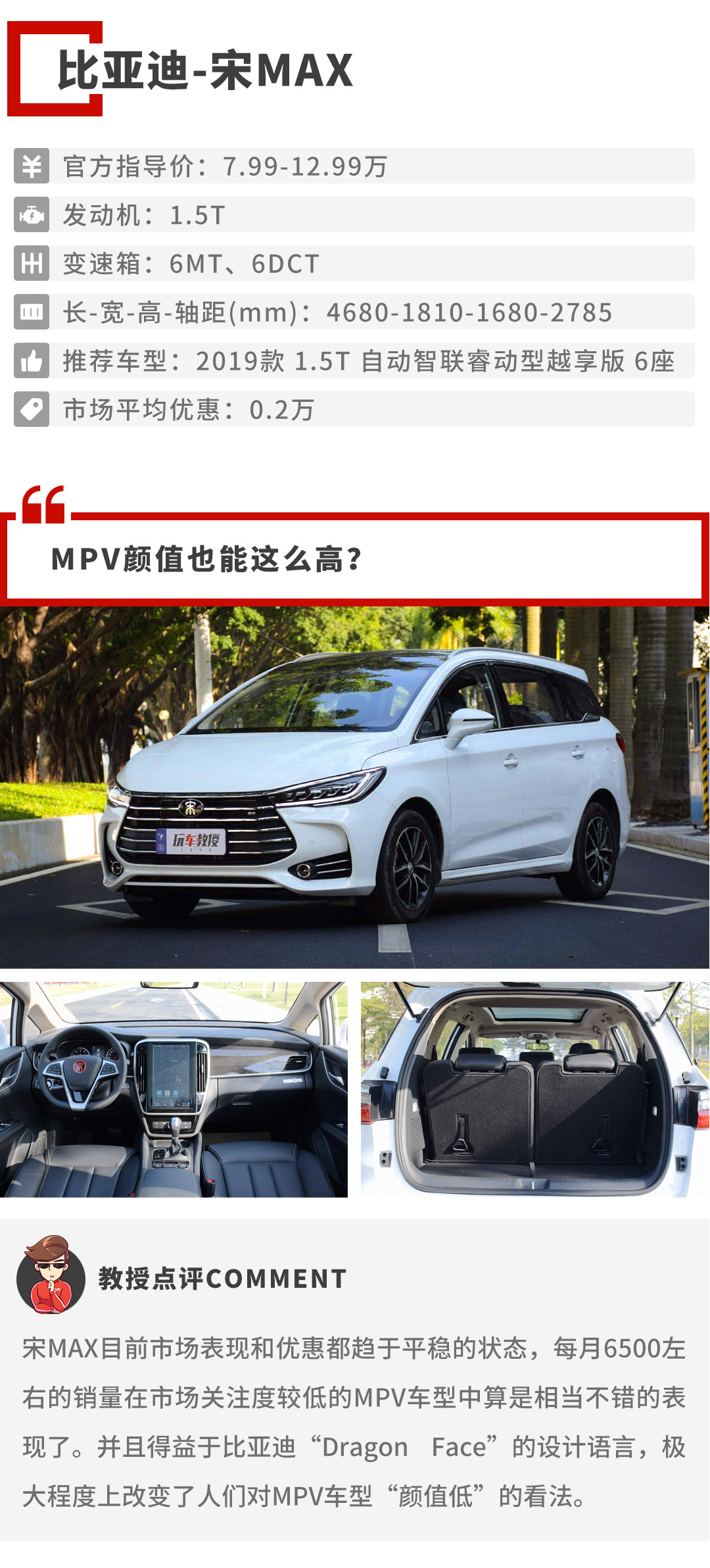 宋MAX在MPV市场上最大的优势自然是其较低的售价,给购车预算在10-15万的消费者提供了一款实用性不差的MPV选择。而且车型延续了品牌一贯的高配置水准,也大大拓展了宋MAX的功能与拓展性。而在一些用户后期使用反馈来看,宋MAX会存在一定的车内异响问题,但这些并不是底盘以及动力总成的毛病,而是中控台、车门等在驾驶过程中零部件之间相互摩擦发出的响声,虽然不是十分严重的问题,但也侧面表现了车辆装配工艺存在的短板。