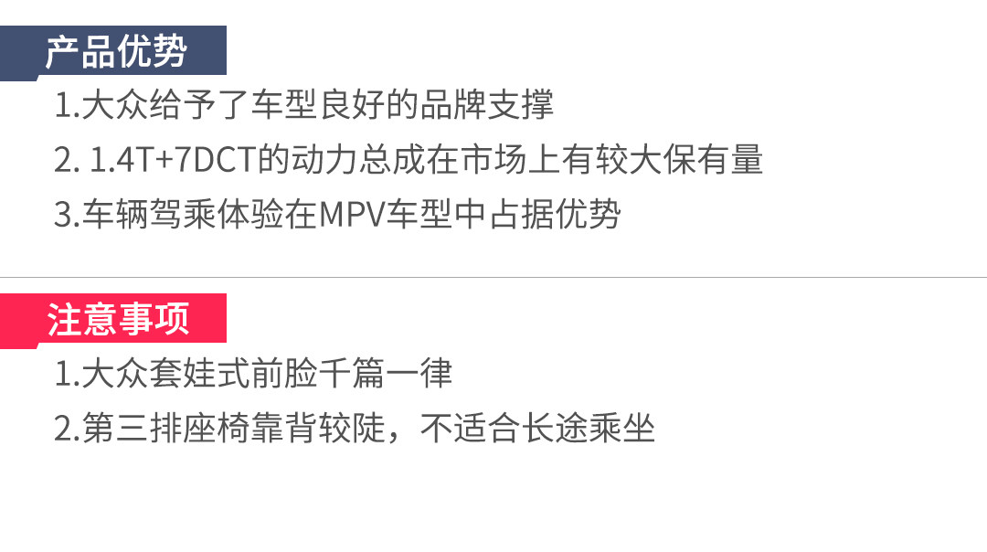 作为大众旗下的车型,“VW”标给到车型的品牌支撑是相当足的,加上代号EA211的1.4T发动机与7DCT变速箱这套动力总成在市场上也有着较大的保有量,车辆养护便宜且方便。