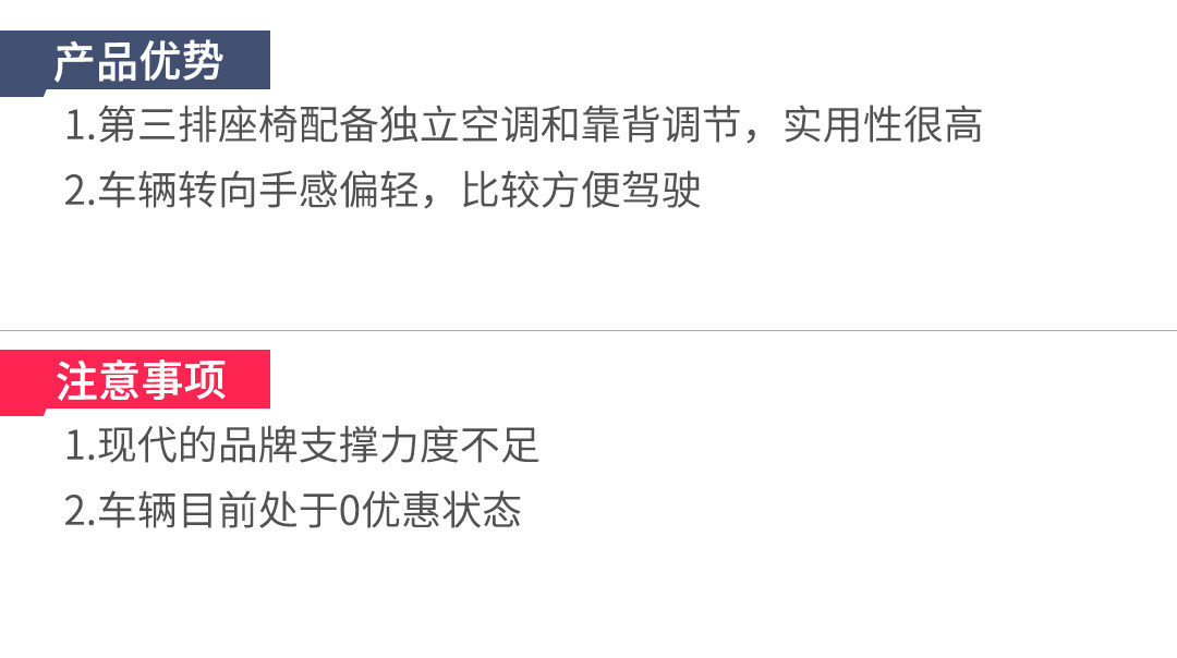 韩系车向来喜欢在配置上给消费者制造惊喜,胜达也不例外,除了第三排独立空调和座椅靠背调节外,后备箱还有一键放倒第二第三排座椅的功能,车辆载人和置物的转换轻松方便。不过目前由于胜达刚完成换代不久,所以车型还处于0优惠的状态,等后期优惠到位后,想必该车凭借着极高的实用性与性价比能够圈粉不少消费者。