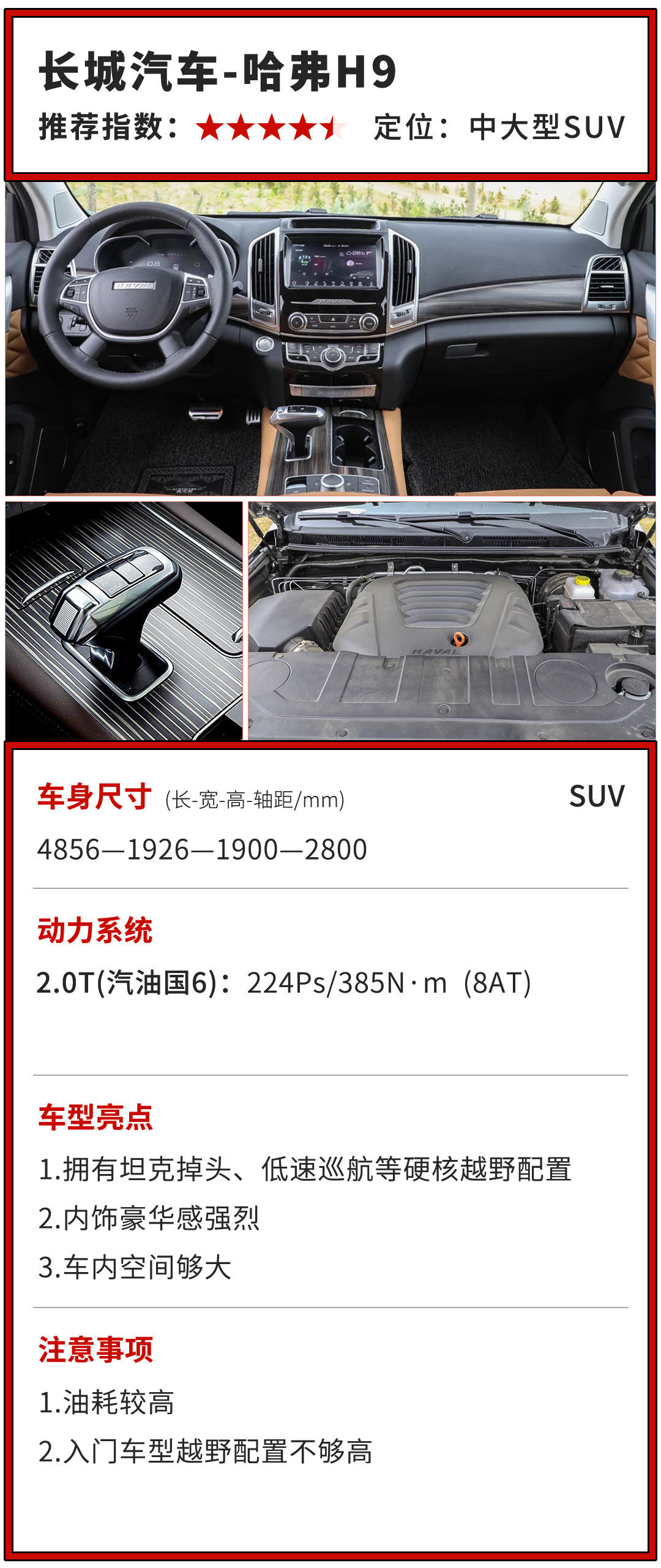 虽然哈弗H9是一款很值得推荐的中国品牌硬派越野车,但在入手之前有件事需要考虑清楚,那就是H9本身整备质量就不小,加上只采用了一台基础排量比较小的2.0T汽油引擎,因此油耗难免就比较高了。另外,H9的入门版车型越野配置比较斋,上述的几个硬核越野装备都需要选装。