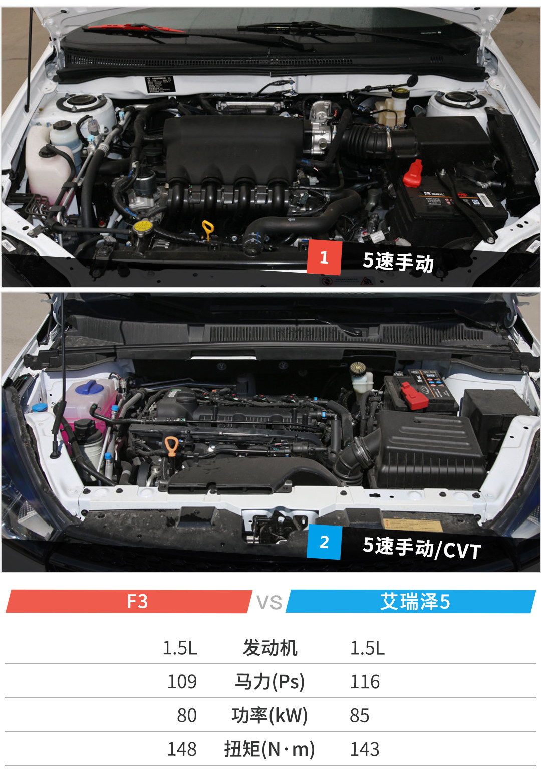 两款车型在动力上均采用1.5L发动机,不过F3所搭载的这款1.5L发动机真的是有点年头了,所以在油耗上的表现会比艾瑞泽差不少。但好在F3提供整车质保四年或者10万公里,可以不用为后期的用车问题而烦恼。