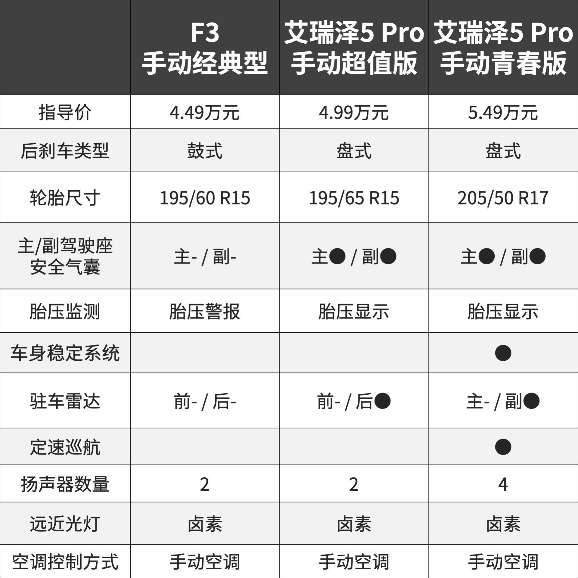 上面这张为F3与艾瑞泽5低配与次低配的部分配置表,可以看出F3在配置上的缩水真的非常“厉害“,厉害的程度甚至到了连一个安全气囊都没有,这无论对驾驶者还是乘客自身的安全都非常没有保障。只可惜目前国内对气囊的要求没有相关规定,仍属于一个灰色地带。