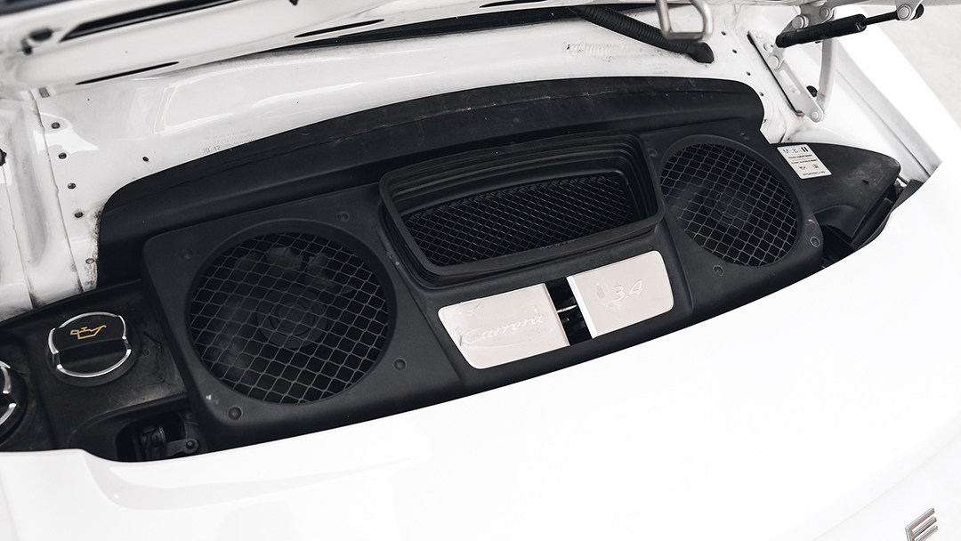 打开小小的引擎盖,与过往一览无余的引擎舱相比,新时代的911已经用大面积的饰板遮挡住了“杂乱”的引擎内构,除了那块“Carrera 3.4”的铭牌,就没剩什么引擎细节可看了。深藏在这车尾之内的,是一台3.4L自然吸气水平对置6缸引擎。350匹的峰值马力,意味着这款发动机的升功率超过了100匹马力,这是保时捷自然吸气引擎数十年发展技术积累的体现。