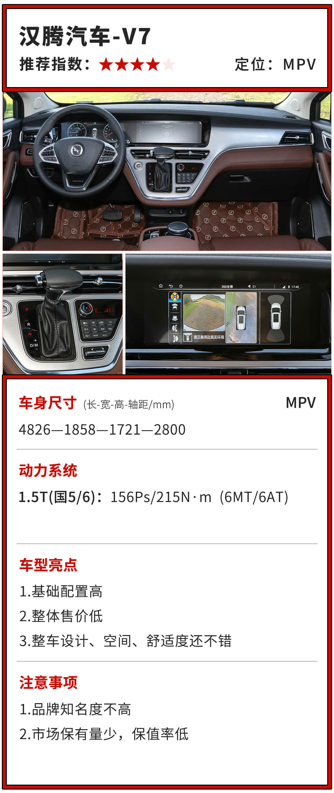 此外,较低的价格和较高的配置也是汉腾V7的卖点,全系标配车身稳定程序、胎压监测、自动驻车、上坡辅助等配置,因此你要是预算有限,但又想买一款配置高一点的MPV,那汉腾V7还是可以考虑一下的。