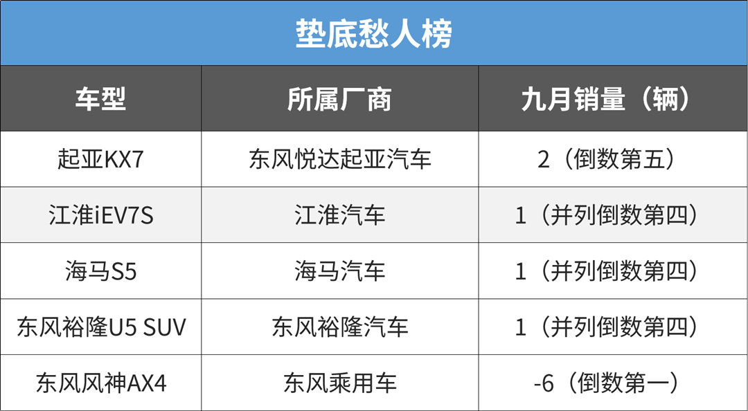 对比排名前列的车型动辄过万的销量,万倍以上的差距,不知垫底的车型所属车企的负责人内心会作何感想?盼着能有多一位客户下单的销售人员状况有多“凄惨”?