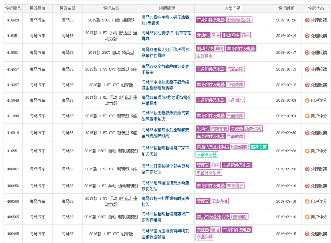 但真正“击垮”海马S5还是频发的质量问题,作为汽车核心的三大件和车身附件成了投诉的“重灾区”,海马坚持正向研发的行为绝对值得称赞,但如此不稳定的后期表现是想让消费者当“白老鼠”?而且在关乎性命安全的气囊和制动系统同样榜上有名。销量崩坏,是市场给出的回应。