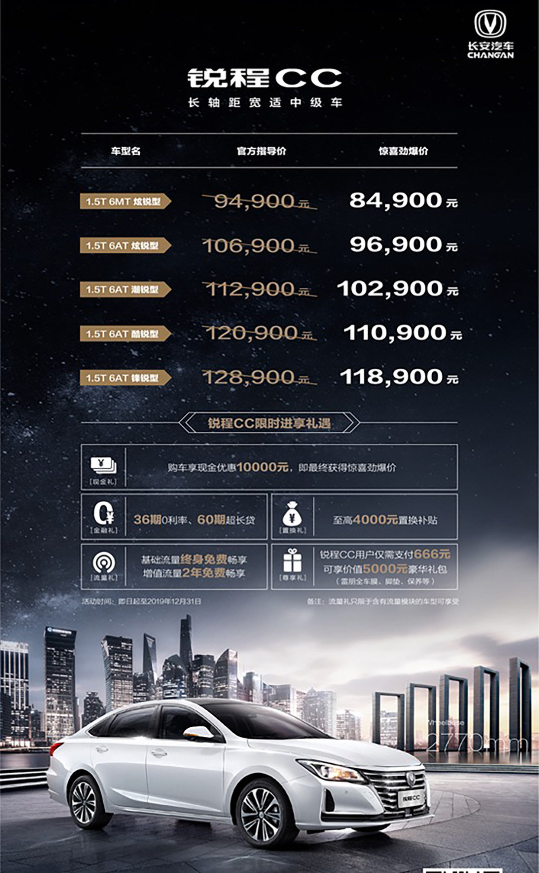 10月18日,长安锐程CC正式上市,新车官方售价9.49——12.89万元,即日起至12月31日购车,可享受10000元购车优惠,售价低至8.49万元起。除此之外,新车该提供贷款购车三年零利率金融礼、至高4000元置换补贴置换礼666元尊享价值5000元豪华礼包和基础流量终生免费畅享,增值流量两年免费畅享流量礼包,购车政策诚意十足。锐程CC属于睿骋CC的改款车型,新车在外观和配置上面进行了全面升级,产品竞争力进一步加强,此次减价加配的做法,无疑将受到消费者的青睐,未来市场表现值得期待。