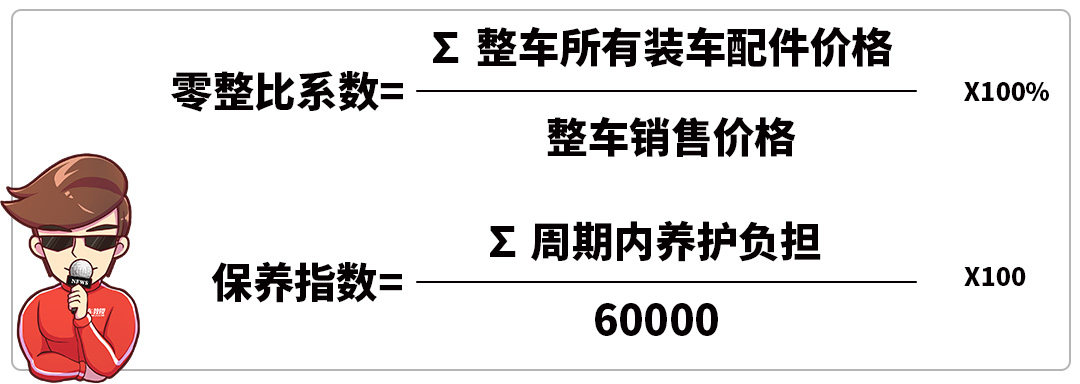 汽车零整比系数,简单来说就是把汽车的配件全换了,所花的钱能买几辆新车,如此反映出不同车型配件维修成本。保养指数,是通过计算样本车型保养周期内(自新车使用之日起3年或行驶里程60000公里)在4S店的养护项目、配件及工时价格,该指数的高低成为衡量车主养护负担高低的重要指标。零整比系数、保养指数的计算方法如上图。