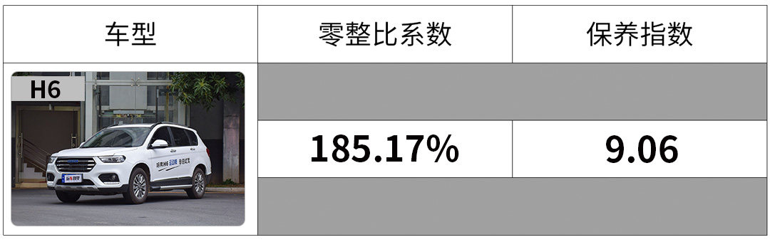 紧随其后的是我们国产车-哈弗H6,零整比系数仅为185.17%,保养指数仅为9.06,所以综合下来哈弗H6的后期养护其实是跟现代ix35差不多。在这里我们可以总结一下,保有量巨大的车型一般配件的价格都不会很高,除非车企想在配件上再坑一把,如果你发现哪辆买菜车维修贵,大胆在评论区举报吧。
