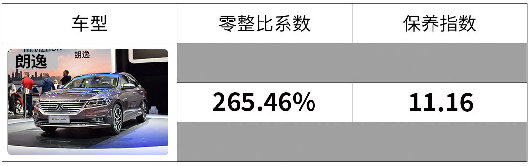 看完了SUV,来看一下轿车。轿车中零整比比较低的车型为朗逸,仅为265.46%,保养指数为11.16。大众由于套娃技术,很多零部件其实都是共用的,但是从零整比来看,它的配件价格也不低,但是又不会太离谱,从这点来看大众真是太懂中国人了。