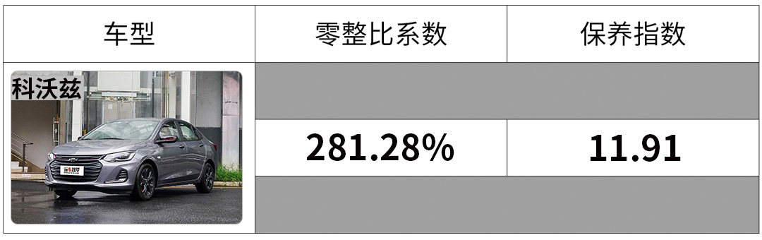 随之而来的是雪佛兰科沃兹,零整比系数为281.28%,保养指数为11.91,数据对比朗逸也只是差了那么一点。而且科沃兹作为一款性价比超高的紧凑型合资车,在价格和配置等方面都让人满意。后期保养维修也如我们看到的这么省,所以你想买合资车,预算又只有8万出头,科沃兹是个不错的选择。