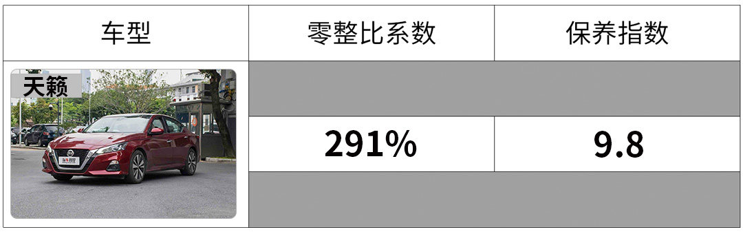 以一辆中型车作为结尾,天籁的数据在这么多中型车中算是比较好的,零整比系数为291%(雅阁为305.52%,凯美瑞为360%),保养指数为9.8。日系车的油耗比较低,维修保养等方面也比美系车便宜,所以“没钱”的广东人偏爱日系车不是没理由的。