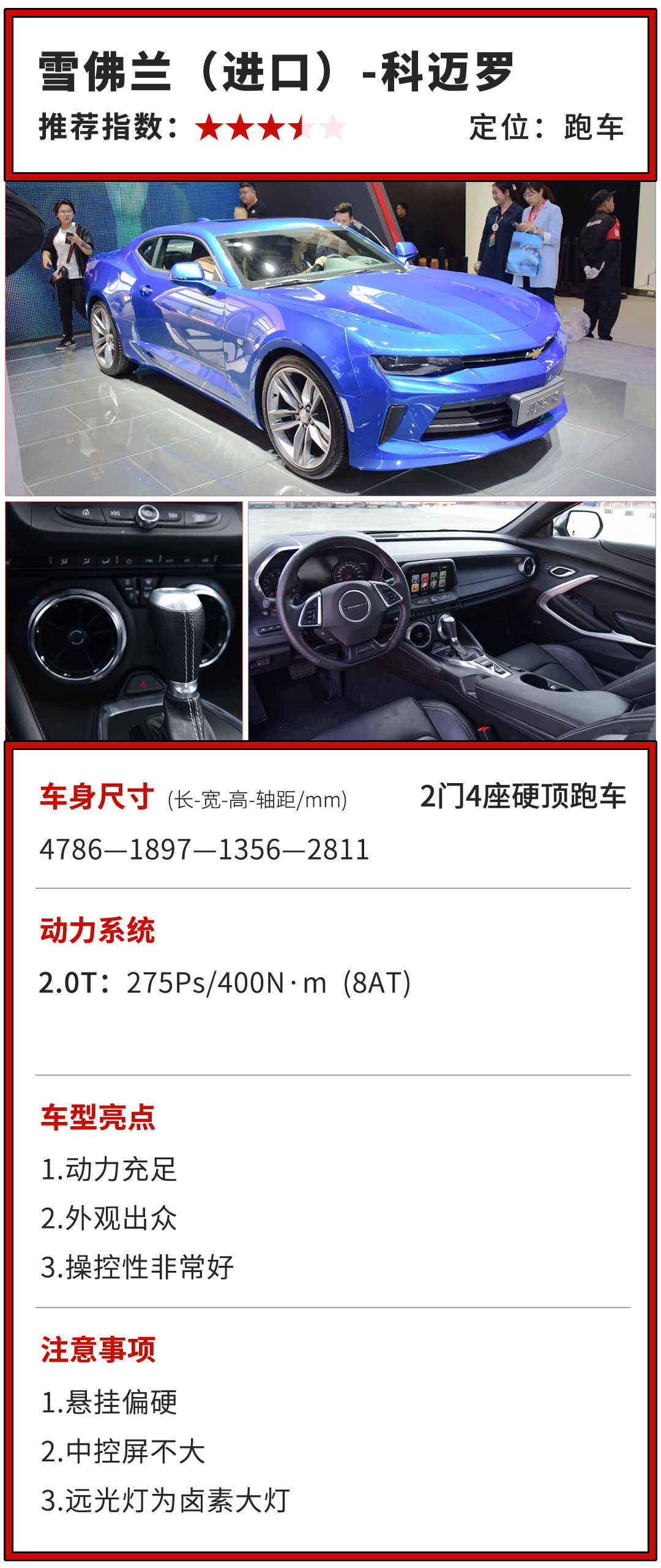微微上扬的车尾,仿佛随时要启动出发,车尾的红色”RS“标识更是彰显科迈罗跑车的身份。从外观上来看,这绝对是一款无可指摘的车型。