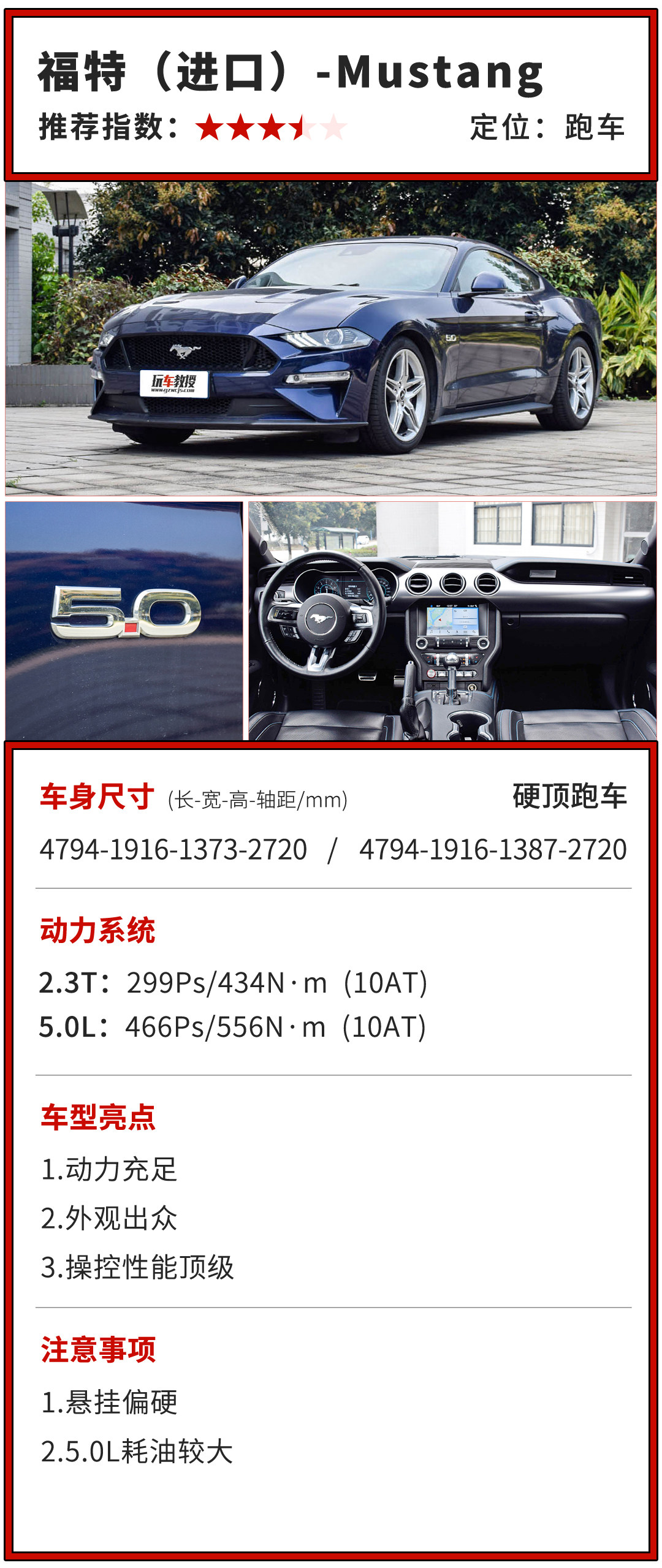 福特野马不仅拥有着极富驾控欲望的内外设计,汽车的动力表现同样容置疑,新车搭载5.0升机械增压V8发动机,5.0LGT版最大扭矩达到556N·m,这使其在同价位性能跑车中综合表现拔尖。