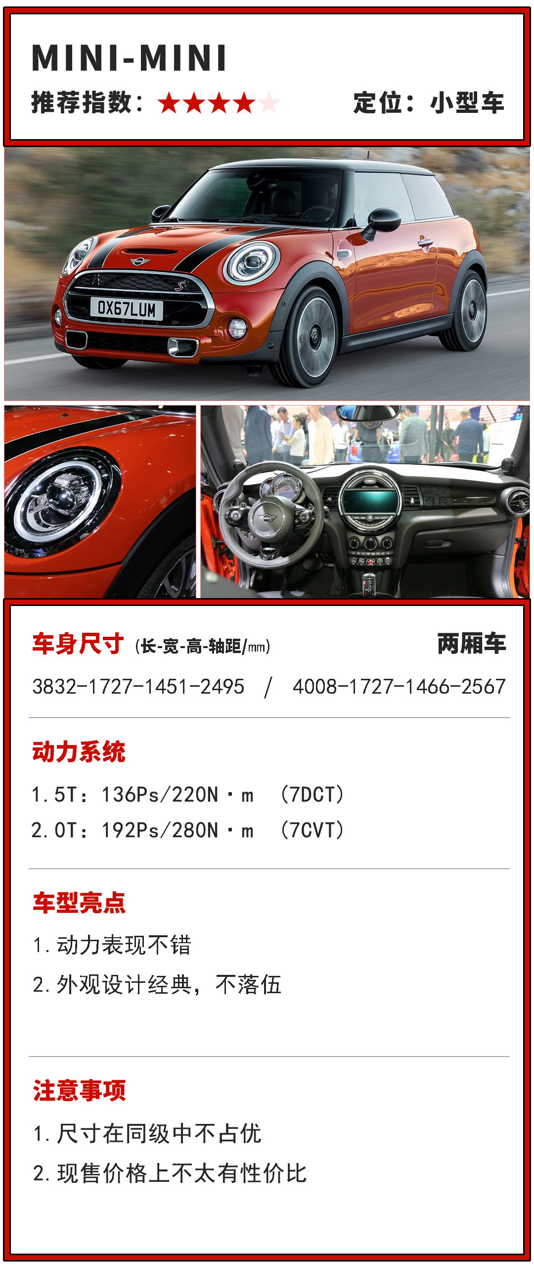 新MINI继承了老款MINI的经典圆润可爱造型,同时MINI的品牌定位也不断提高,渐渐成为时尚豪车的代名词。