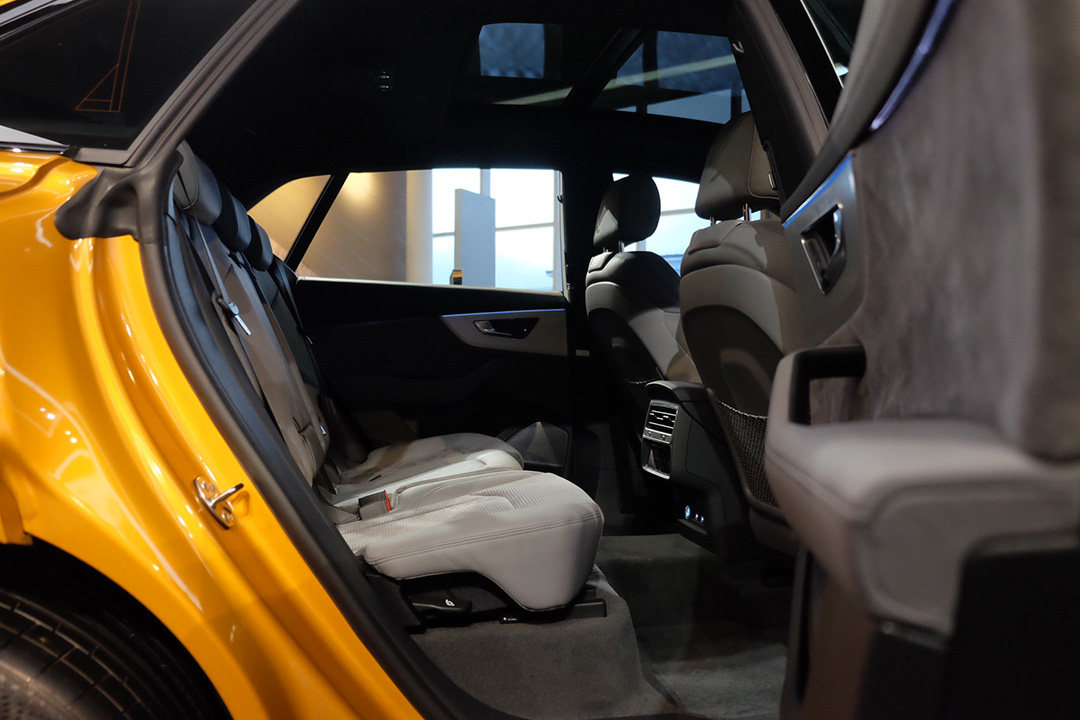 侧面以及尾部则是奥迪Q8的正确打开方式,侧面来看其轿跑SUV化痕迹相当明显,车顶从B柱就开始逐渐下滑,在C柱形成了一个优雅的的角度,并且你会发现这种设计还让它变得更为修长,而若是打开无框式车门,这更能让你眼冒心心。尾部则是采用了大量的贯穿式设计,使这接近2m宽度的SUV看起来更为宽大。