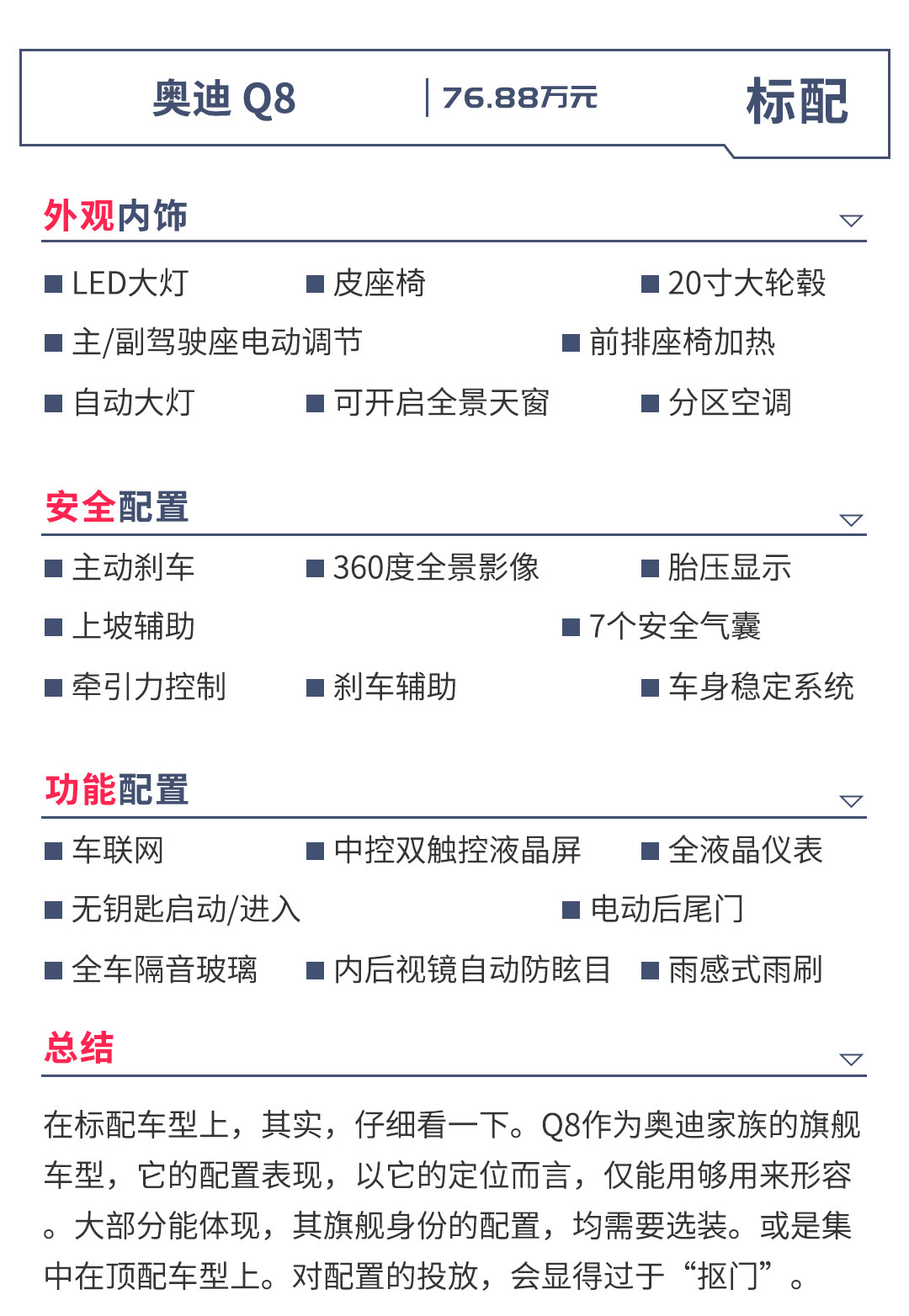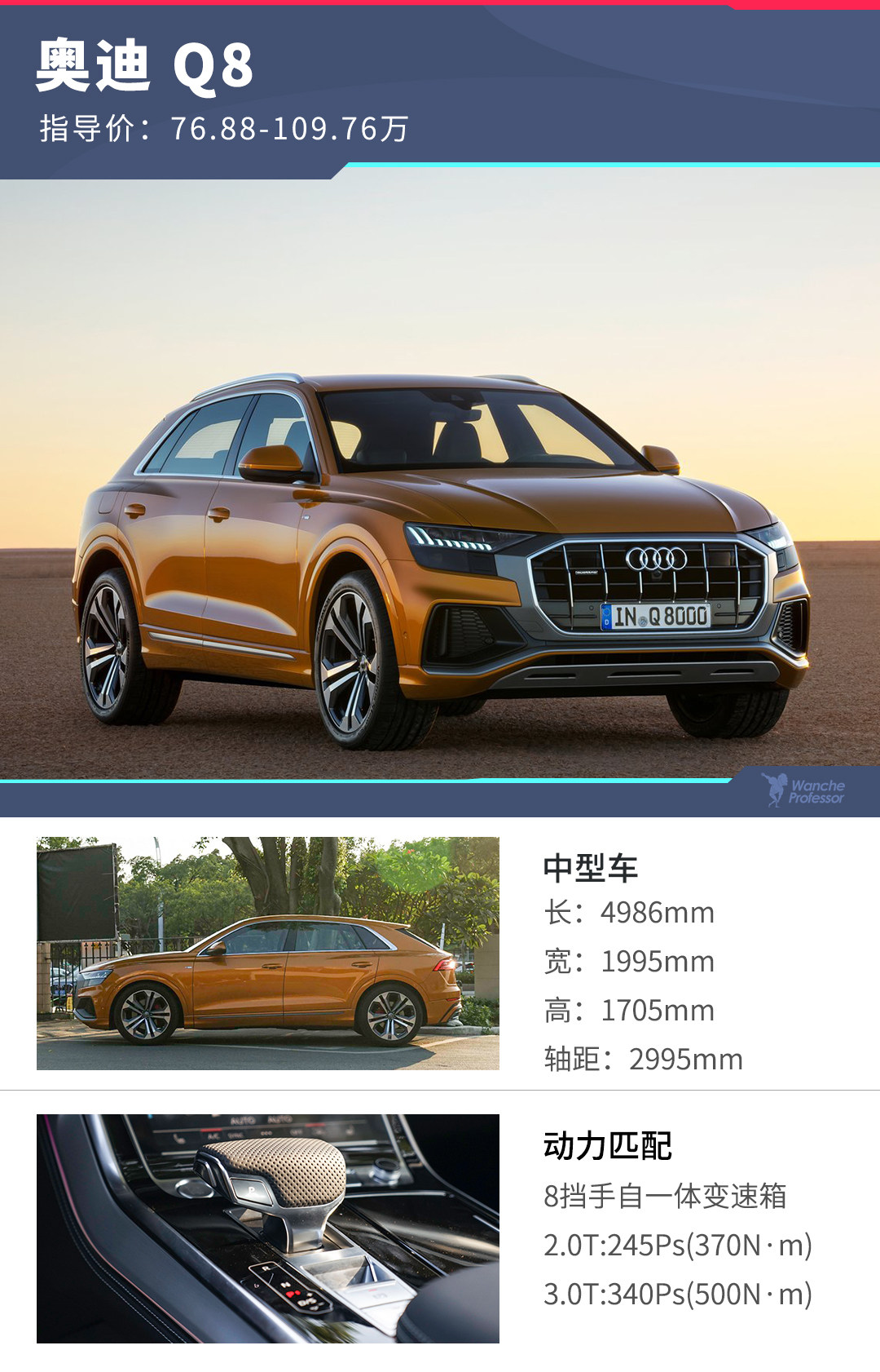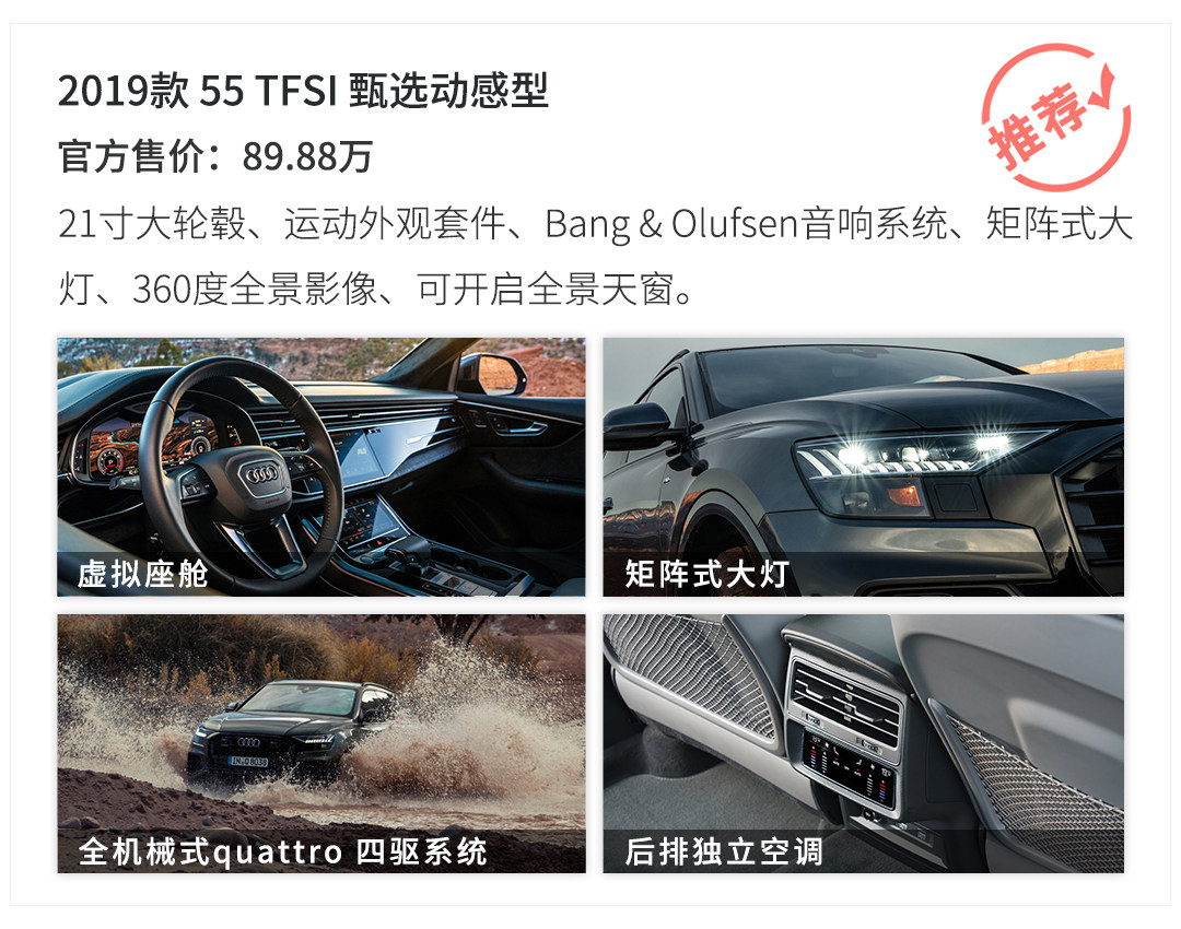 奥迪全新旗舰SUV,在10月25日正式亮相。新车共推出6款车型,两组动力总成,分别为2.0T、3.0T发动机,与其相匹配的均为8挡手自一体变速箱。价格区间为76.88—109.76万元。那么,Q8作为奥迪家族的全新车型,也是旗舰车型,究竟给我们带来什么新东西,以及哪一款最值得购买呢?