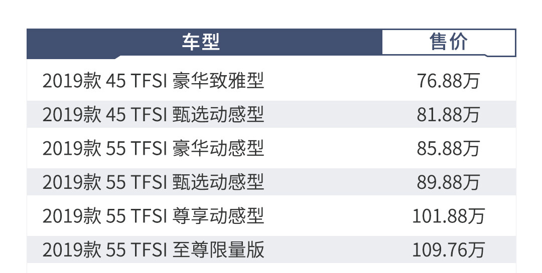 另外,在45 TFSI车型上,两款配置的差距为:运动套件、驾驶位座椅记忆以及Bang & Olufsen音响系统,差价为5万元。教授认为,如果是选择45 TFSI车型的消费者,建议还是直接买高配,毕竟,Bang & Olufsen的音响系统不仅音质好,而且逼格还高,绝对值回票价。