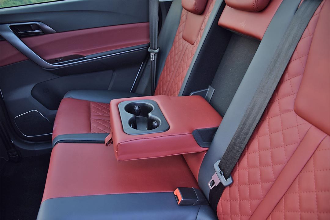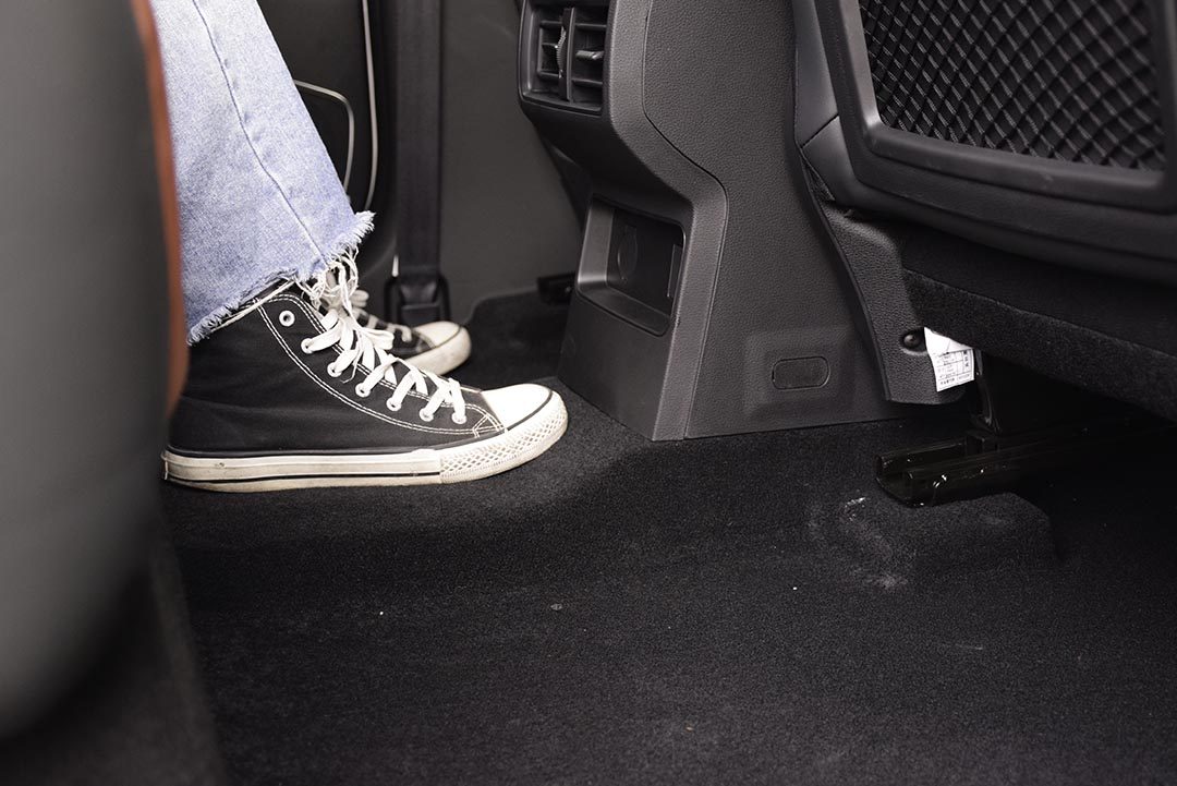 值得称赞的是,第二排中间座椅配备了一个未被阉割的独立头枕,而且配有中央扶手,地台中央的凸起也不高,体验者42码的鞋子放上去也不会有阻碍。