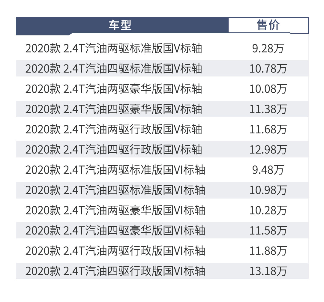 我们先以价格最低(9.28万元)的2.4T汽油两驱标准型为例,看看它的配置怎么样。