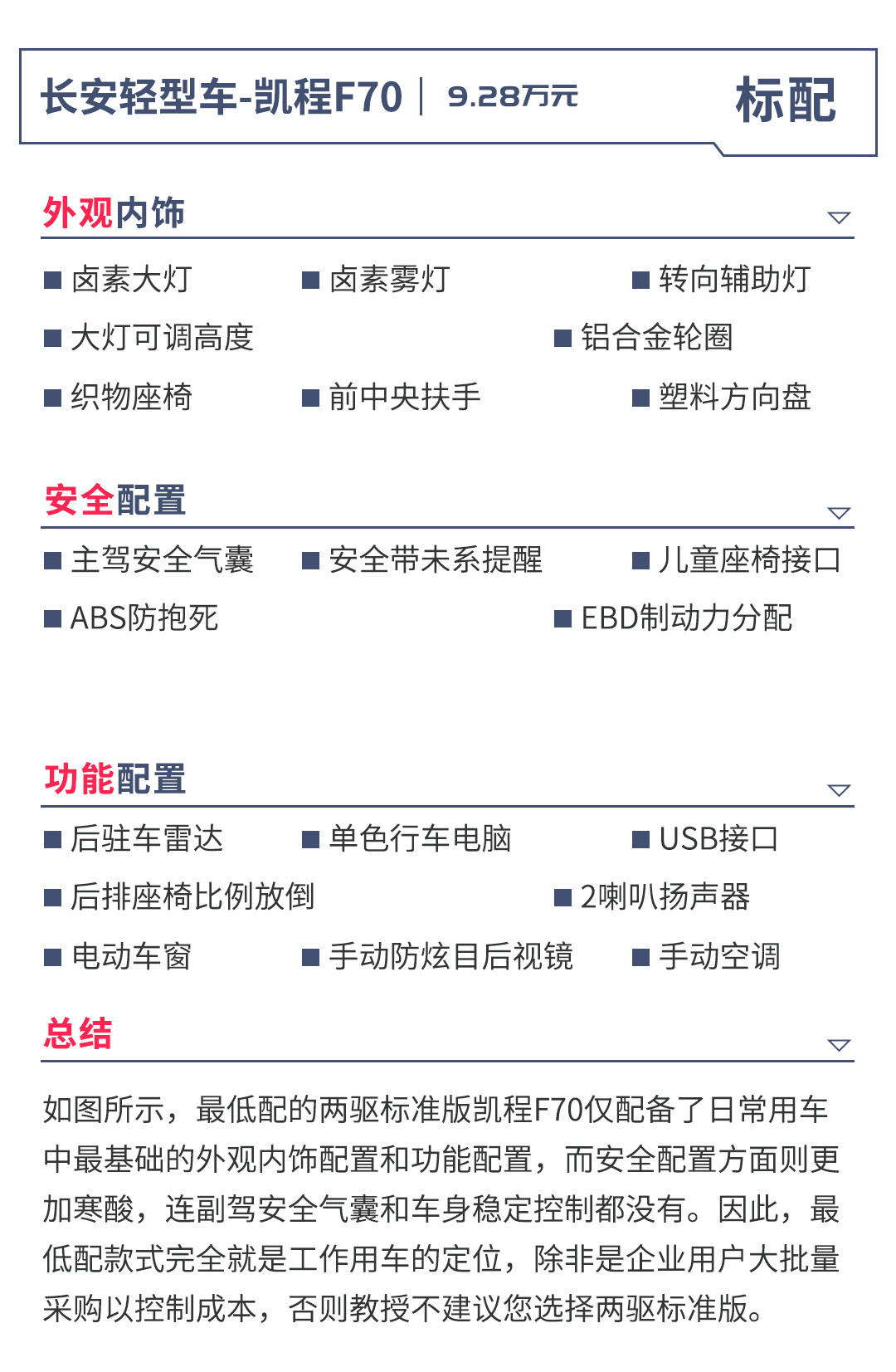相信多数个人用户,在看到这样的配置表时,都不会选择最低配的两驱标准型。教授建议,你如果真的很喜欢凯程F70但预算又紧张,那么咬咬牙买个四驱标准版也好,起码有车身稳定控制系统和陡坡缓降,而且都买这种越野玩乐型皮卡了,两驱有什么意义。另外需要注意的是,无论搭载哪款引擎,不同版本的款式的配置都是一样的。