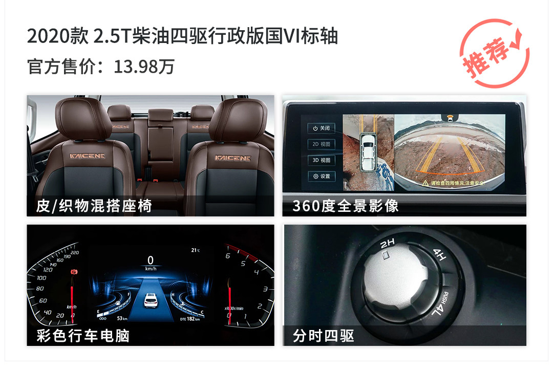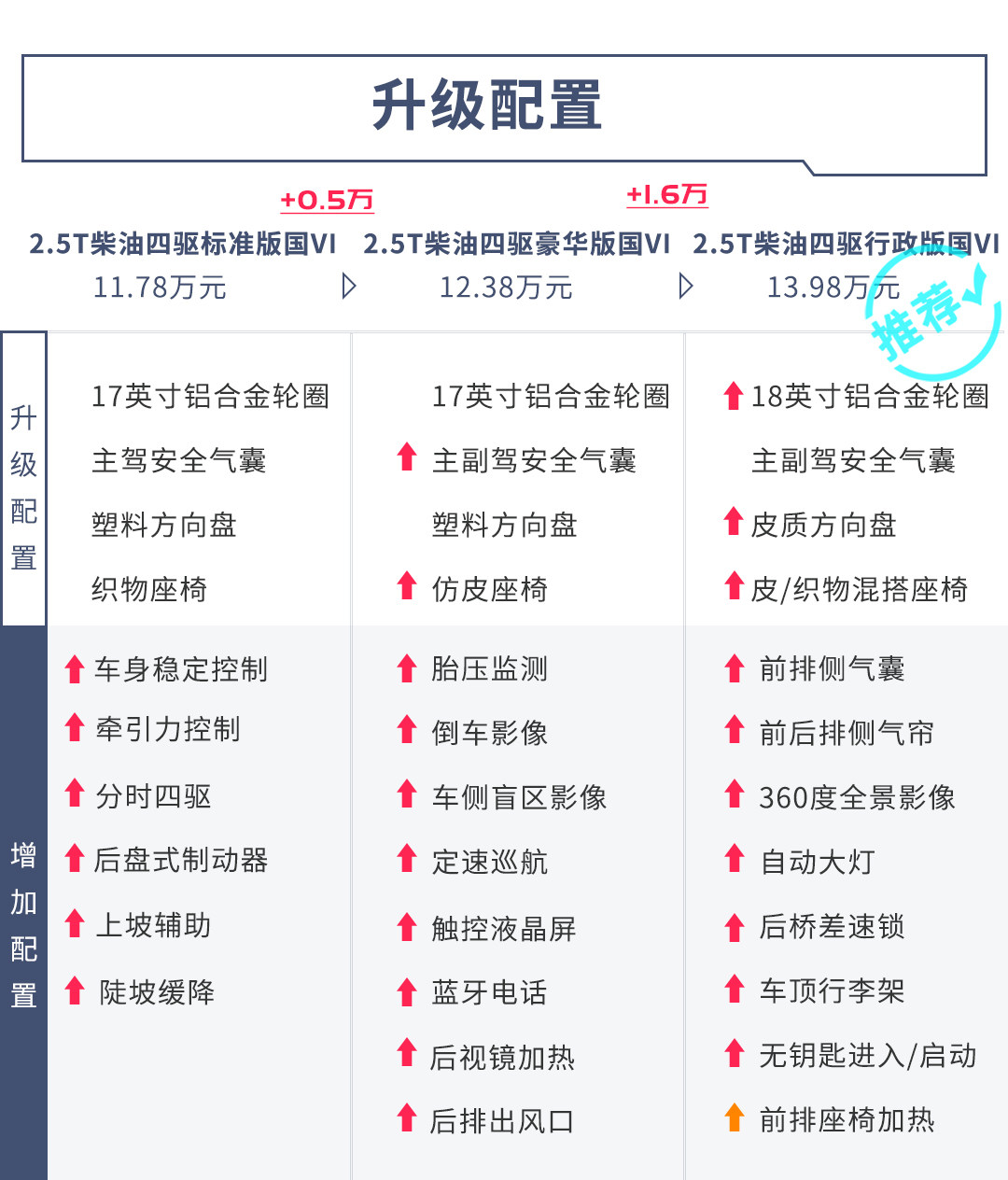 至于配置方面,教授最推荐的是顶配四驱行政版。四驱这个必买是毋庸置疑的,而顶配车型还有后桥差速锁,越野性能进一步提升。360度全景影像对于这种大块头皮卡来说无论是市区还是野外都很有用,能避免很多不必要的剐蹭。最关键的是顶配款式的主被动安全配置齐全,用车更放心。配置这么齐全,顶配14万不到的指导价真心不算贵了。