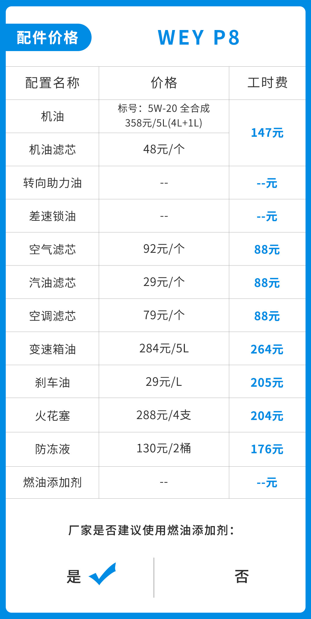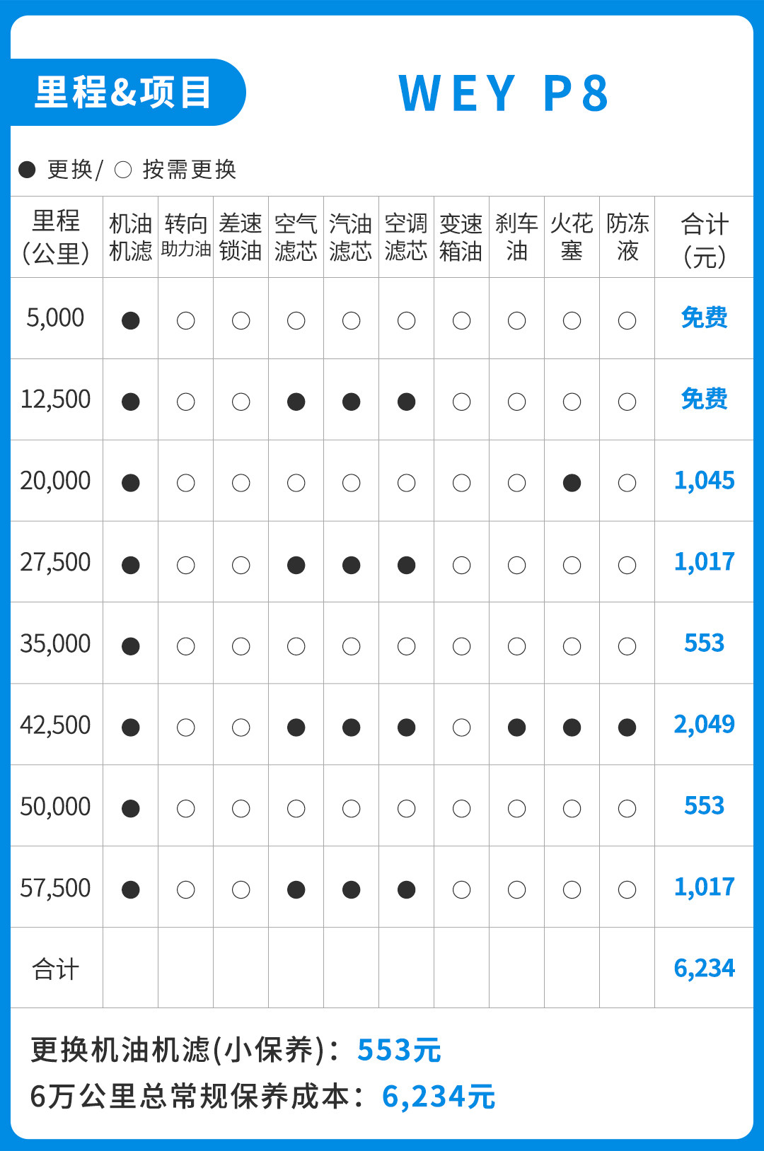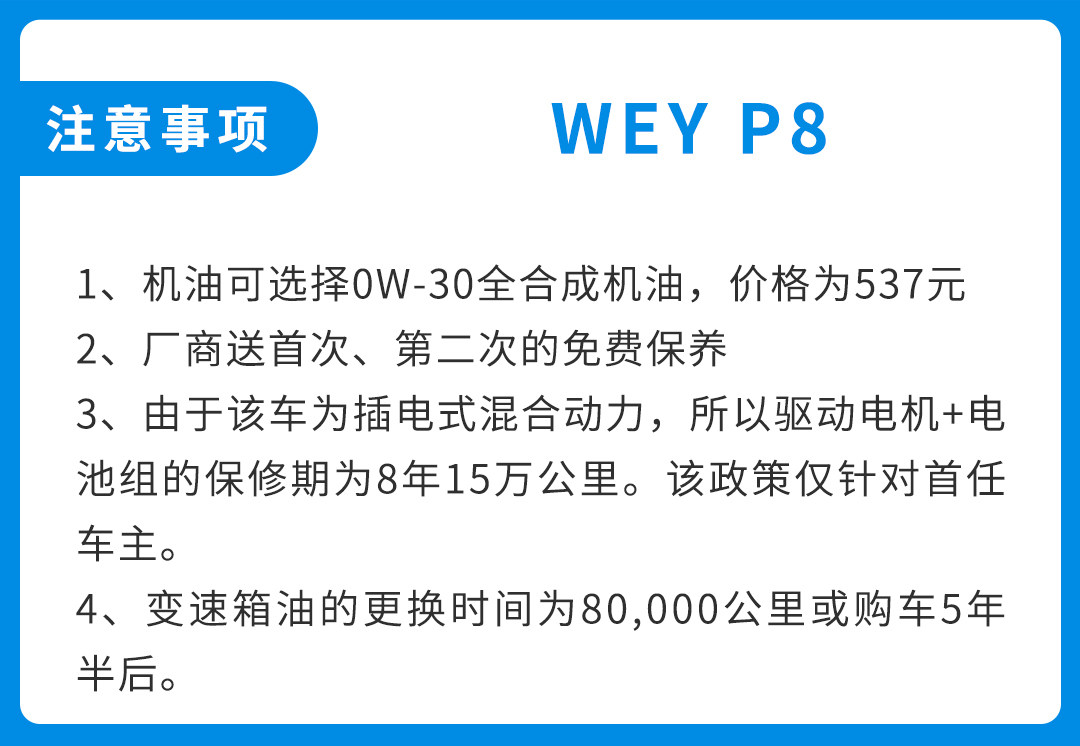 以一款插电式混合动力紧凑型SUV来说,两次免费的保养对于车主来说还是很省心的,只是WEY P8整体的用车费用还是属于比较高,尤其是2.0T发动机在油耗上拖了不少后腿。不过如果车主的生活圈是纯电里程所包括到的,而燃油只当偶尔出远门才使用,那么WEY P8作为大城市的“妥协”车型似乎又未尝不可。