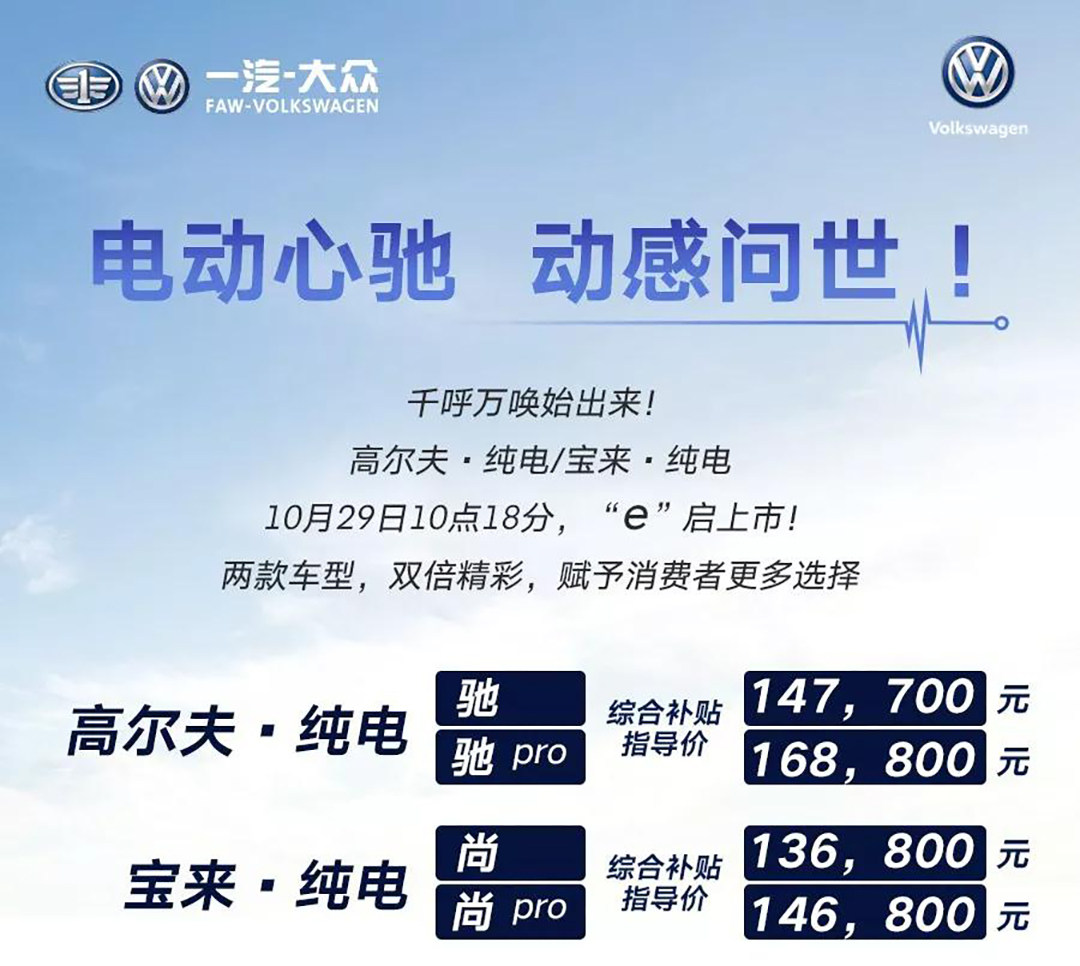 10月29日,一汽-大众高尔夫·纯电(e-Golf)、宝来·纯电(e-Bora)正式上市,其中高尔夫·纯电(e-Golf)共推出两款车型,综合补贴指导价14.77-16.88万元,宝来·纯电(e-Bora)同样推出两款车型,综合补贴指导价为13.68-14.68万元。