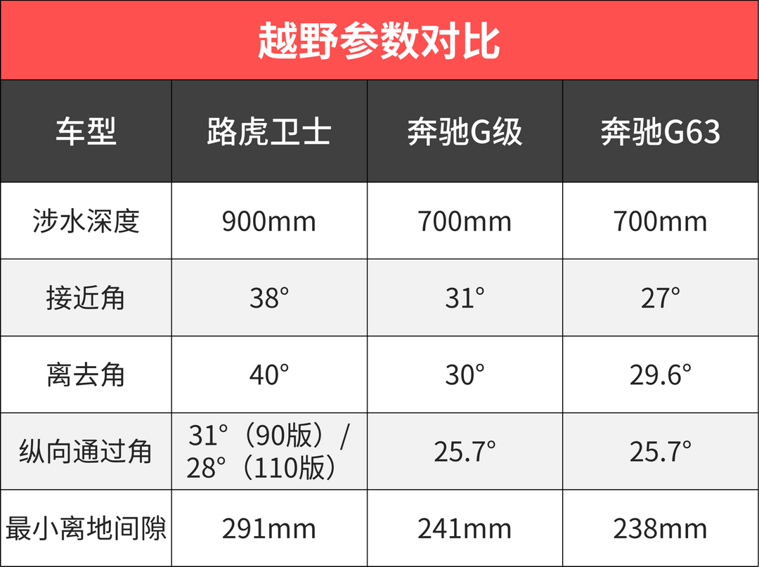 由于卫士SVR版尚未有车身参数,参考一下卫士和G级的车身数据